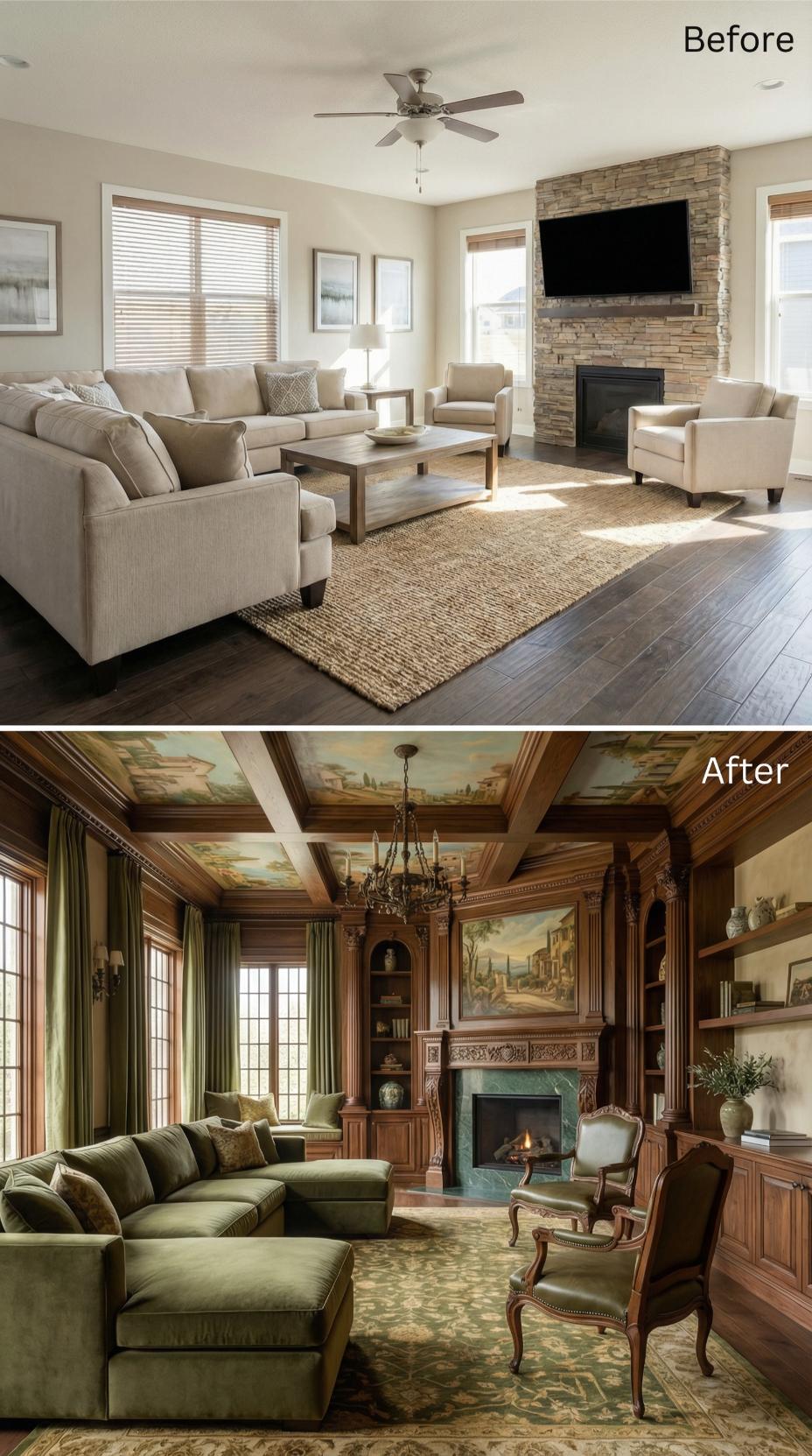 Rich walnut paneling transforms this builder-grade living room into a sophisticated retreat perfect for quiet contemplation. Coffered ceilings adorned with pastoral murals create intimate visual interest, while built-in bookshelves and a marble-surround fireplace anchor the space. Deep emerald furnishings and traditional patterns replace bland beige seating, establishing cozy reading nooks ideal for introverted personalities seeking elegant solitude.
