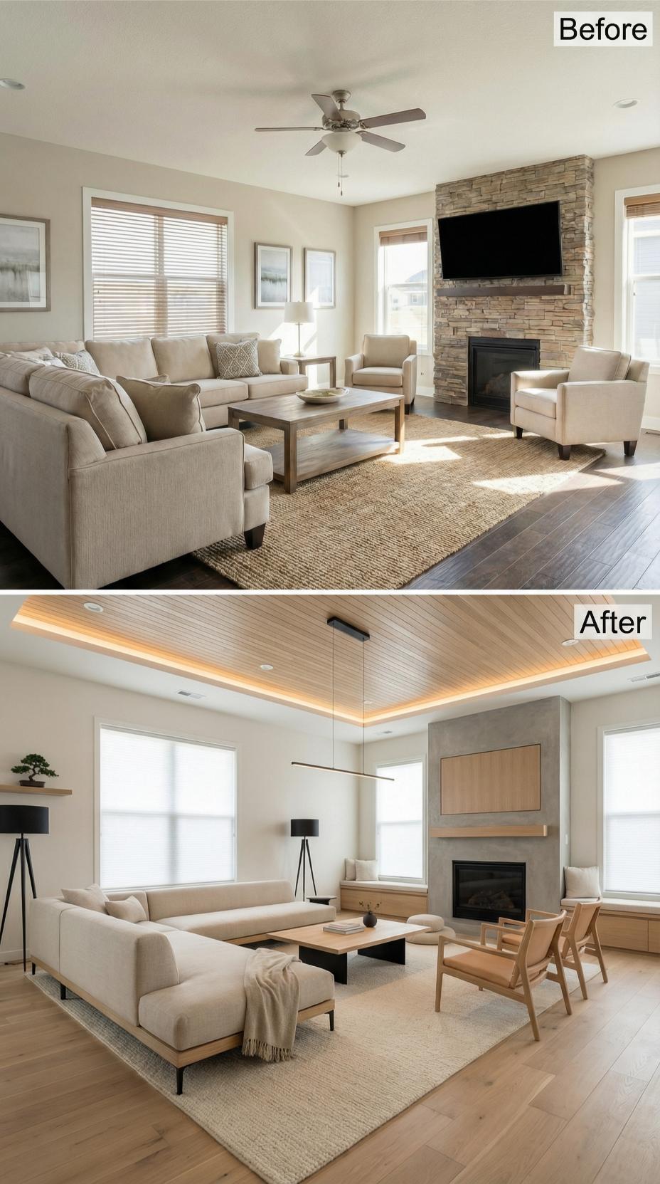 Sophisticated lighting transforms this builder-grade living room for introverts into a serene retreat. The original cluttered furniture arrangement gave way to streamlined pieces with clean lines, while a dramatic wood-clad ceiling with integrated LED strips replaced the basic ceiling fan. Modern tripod lamps and a floating linear pendant create layered illumination perfect for quiet evenings at home.