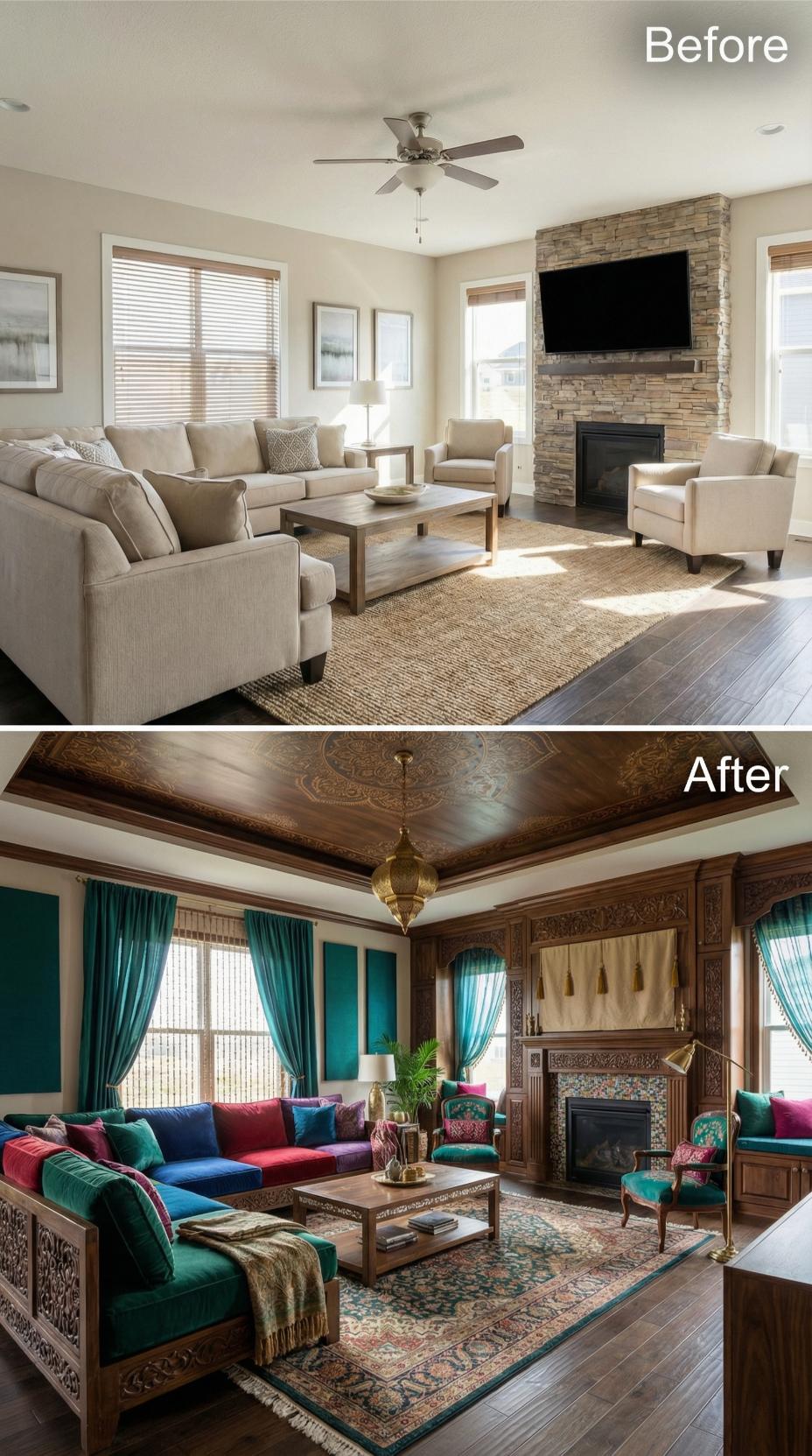 Rich emerald velvet seating and ornate carved woodwork dramatically elevate this formerly bland builder-grade living room for introverts. Luxurious teal curtains frame multiple windows while intricate ceiling details and brass pendant lighting create an intimate, cocoon-like atmosphere. The colorful sectional paired with jewel-toned pillows and traditional Persian rugs establishes a sophisticated retreat perfect for quiet contemplation.