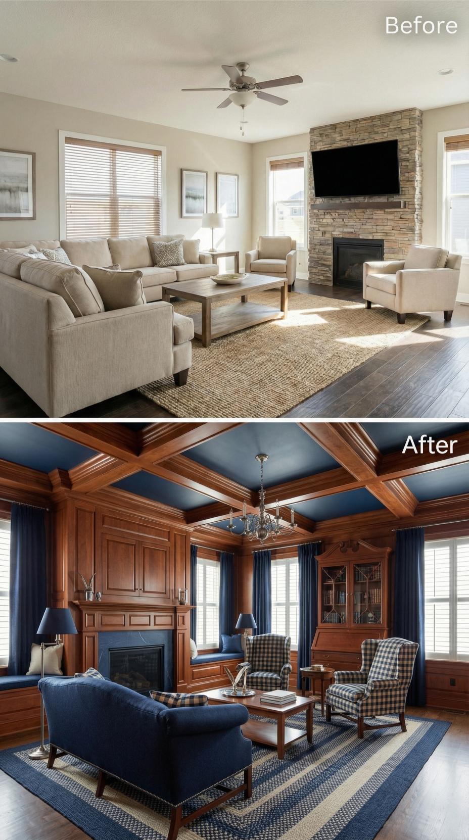 From Beige Builder-Grade to Rich Navy Sanctuary with Coffered Ceilings