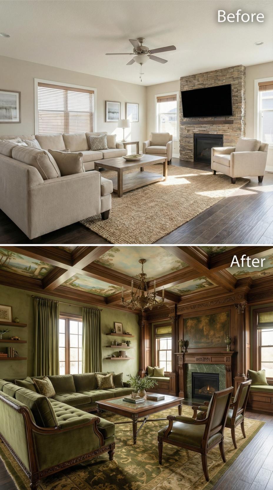 Ornate coffered ceilings painted with scenic murals replace the flat white ceiling, while deep forest green walls and luxurious velvet upholstery transform this builder-grade living room into an elegant retreat. Traditional wood paneling, floating shelves, and a crystal chandelier create sophisticated layers that appeal to introverts seeking refined comfort. Rich jewel tones and classic furnishings establish the perfect atmosphere for quiet contemplation.