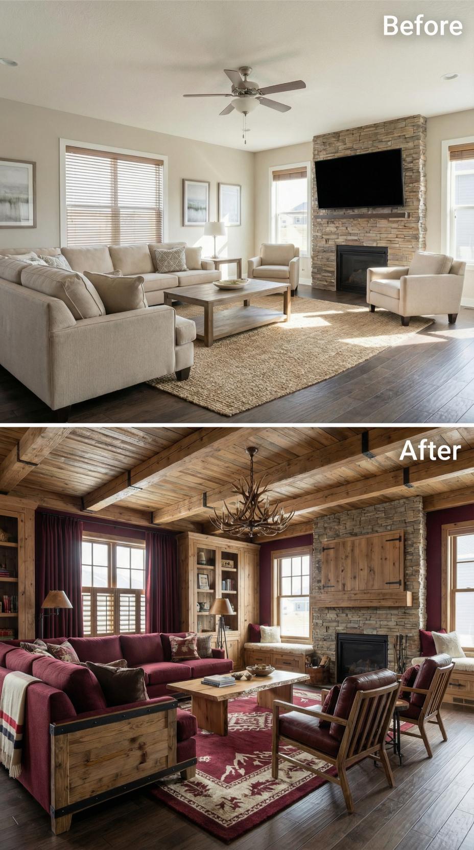 Bold burgundy sectionals and rustic wood beams completely reimagine this once-bland builder-grade living room for introverts. Exposed ceiling planking, built-in cabinetry, and rich jewel-toned textiles create an intimate mountain lodge atmosphere. The antler chandelier and patterned area rug add personality while maintaining the cozy, retreat-like ambiance perfect for quiet evenings.