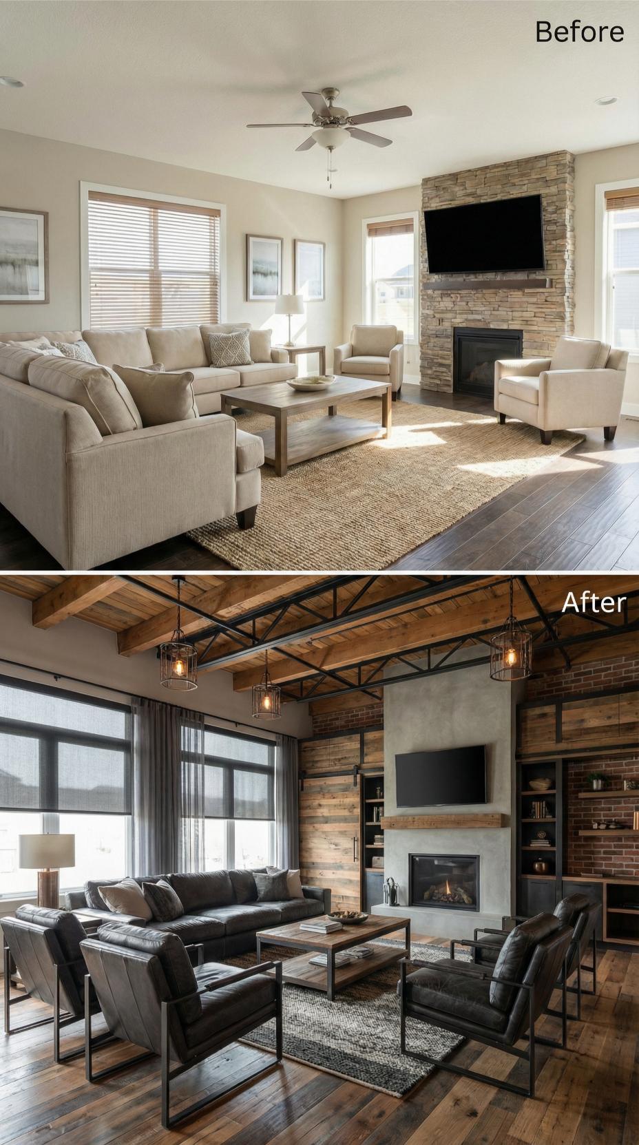 Exposed wooden beams and raw brick walls replaced the generic builder-grade living room’s flat ceiling and plain stone fireplace. Dark leather seating anchors the transformed space, while industrial pendant lights and black metal accents create dramatic contrast. Built-in shelving flanks the modernized fireplace, maximizing storage while maintaining the room’s newfound urban loft aesthetic.