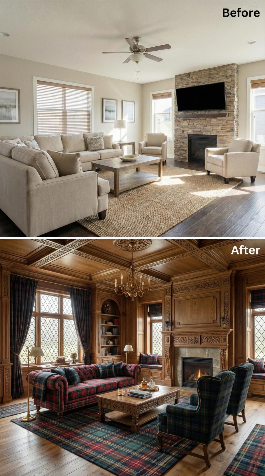 Rich walnut paneling transforms this builder-grade living room into an intimate gentleman’s library worthy of a countryside estate. Elaborate coffered ceilings replace basic drywall, while diamond-paned leaded glass windows add authentic Tudor character. The plaid Chesterfield sofa and tartan carpet create a cozy Scottish hunting lodge atmosphere, perfectly suited for quiet evenings by the fire with a good book.