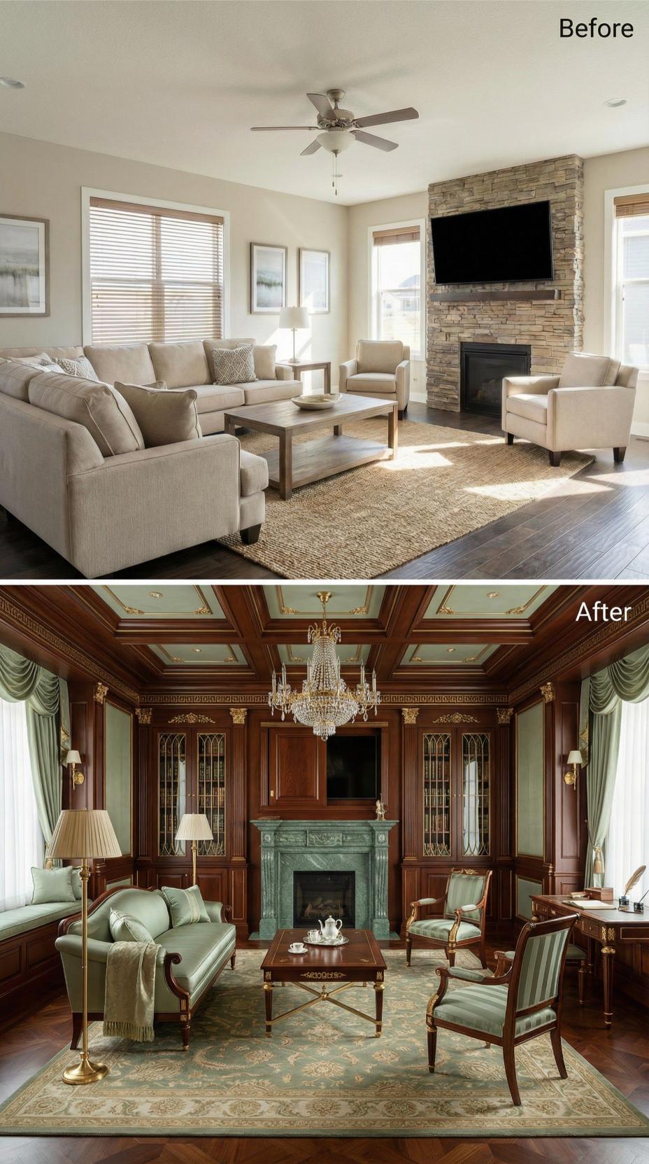 Rich mahogany paneling transforms this builder-grade living room into a sophisticated retreat perfect for introverts seeking solitude. Ornate coffered ceilings replace basic drywall, while built-in bookcases and glass-front cabinets create literary charm. A stunning crystal chandelier illuminates sage green upholstery and traditional furnishings, elevating the space from cookie-cutter neutrals to timeless elegance that encourages quiet contemplation.