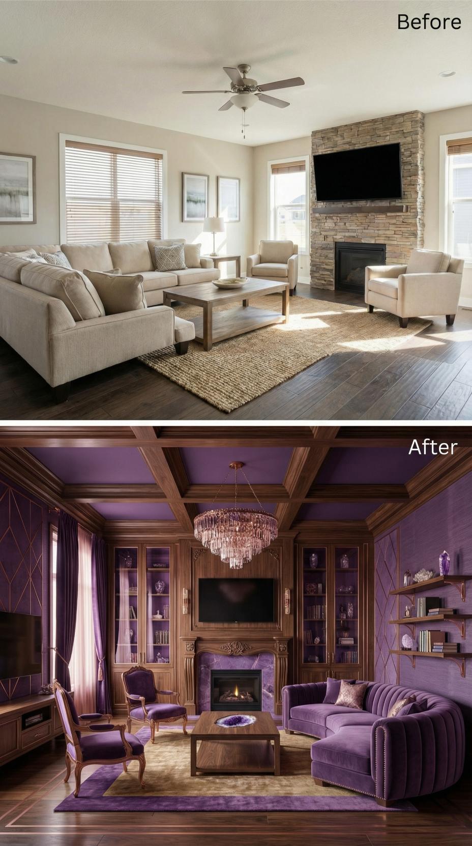 Rich amethyst walls and an ornate coffered ceiling transform this builder-grade living room into an opulent retreat perfect for introverted souls. Custom built-in bookcases replace basic stone fireplace surroundings, while a stunning crystal chandelier elevates the space above standard ceiling fans. Sumptuous velvet furniture in coordinating purples creates intimate seating arrangements, and heavy drapery blocks outside distractions for ultimate privacy and comfort.