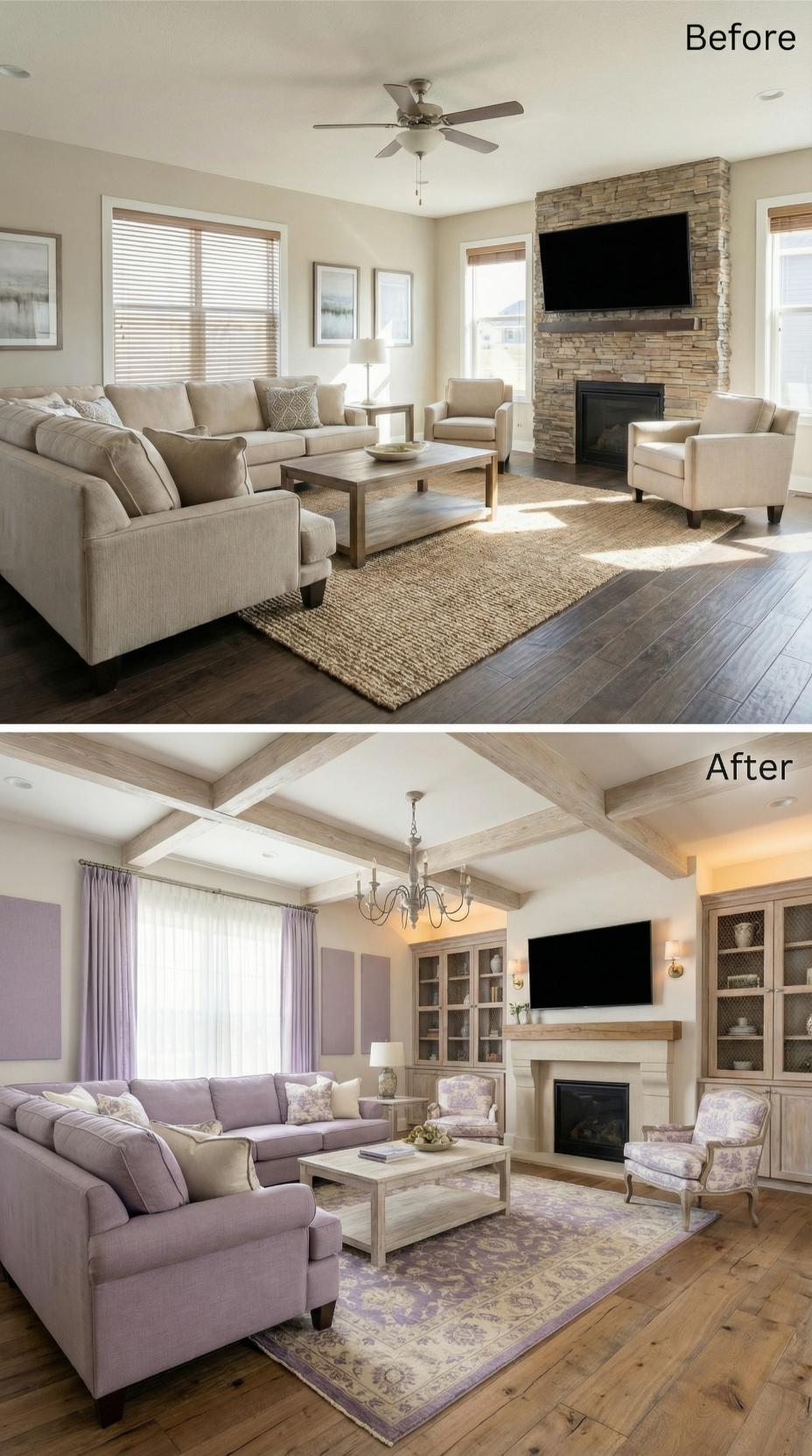 From Beige Builder-Grade to Lavender Luxury with Exposed Beam Drama