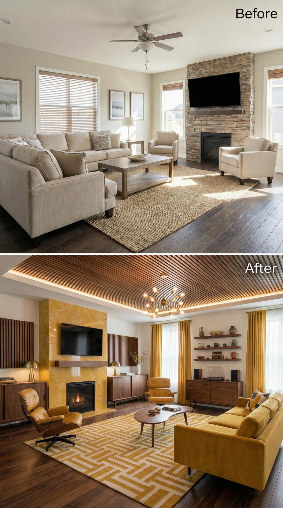 Warm mustard yellow transforms this formerly neutral builder-grade living room for introverts into a sophisticated mid-century retreat. The stone fireplace gains dramatic impact with sleek yellow tile, while wooden slat ceiling treatment replaces basic drywall. Rich walnut furniture, floating shelves, and a geometric area rug create layers of visual interest that encourage quiet contemplation and comfortable solitude.