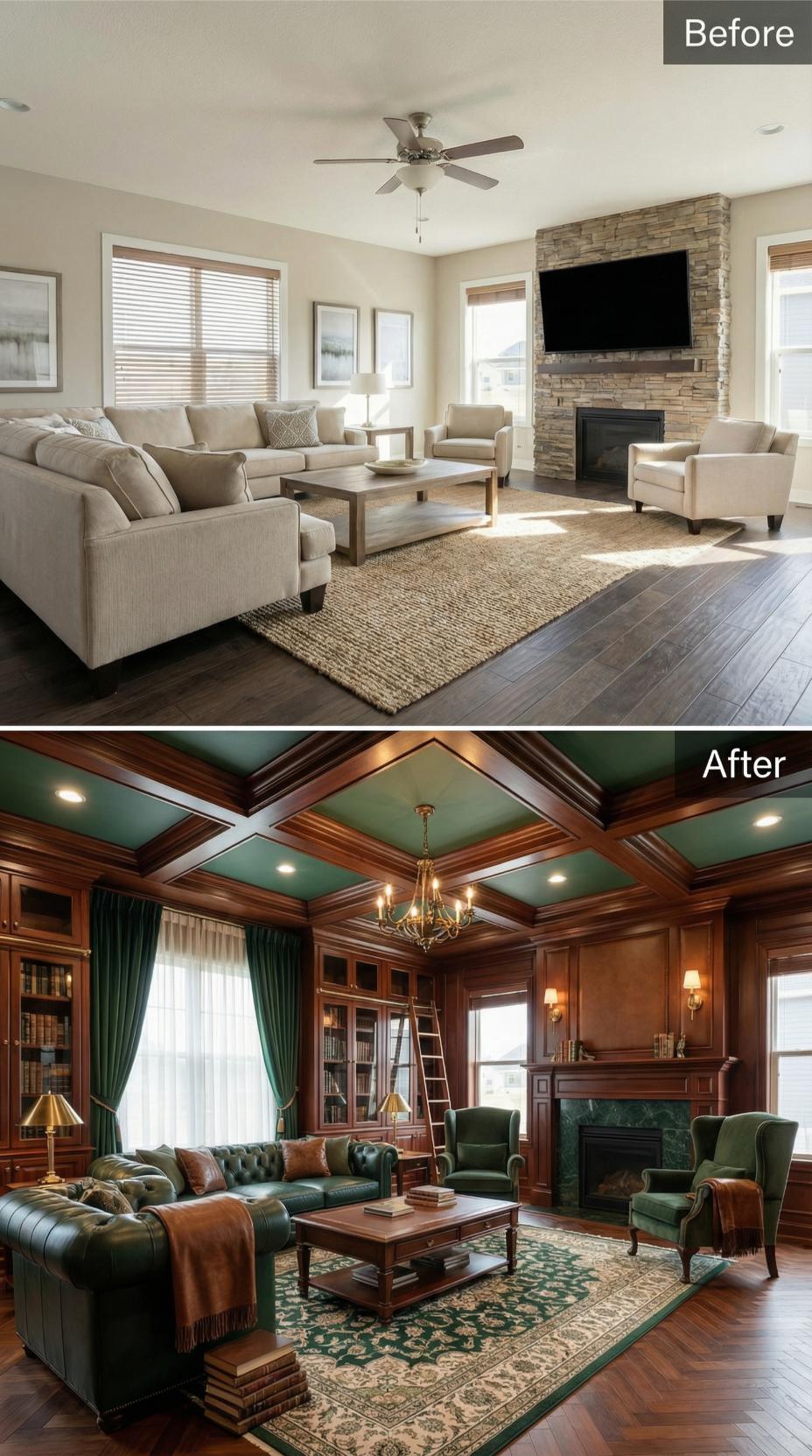 Dark green leather seating and rich wood paneling transform this builder-grade living room into a sophisticated introvert’s retreat. Custom built-in bookcases with rolling ladder create vertical interest while coffered ceilings painted in deep emerald add architectural drama. Warm brass chandelier and sconces provide intimate lighting, while heavy curtains ensure complete privacy for quiet contemplation and reading sessions.