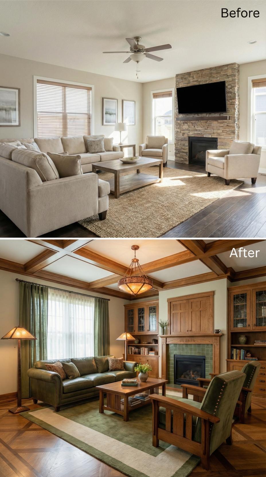 Rich wood built-ins transform this builder-grade living room into a cozy craftsman retreat perfect for introverts seeking solitude. Coffered ceilings replace the plain surface above, while custom cabinetry surrounds the fireplace with book storage and display niches. Warm green textiles and Mission-style furniture create intimate conversation areas, supported by layered lighting from table lamps and a statement chandelier that eliminates harsh overhead glare.
