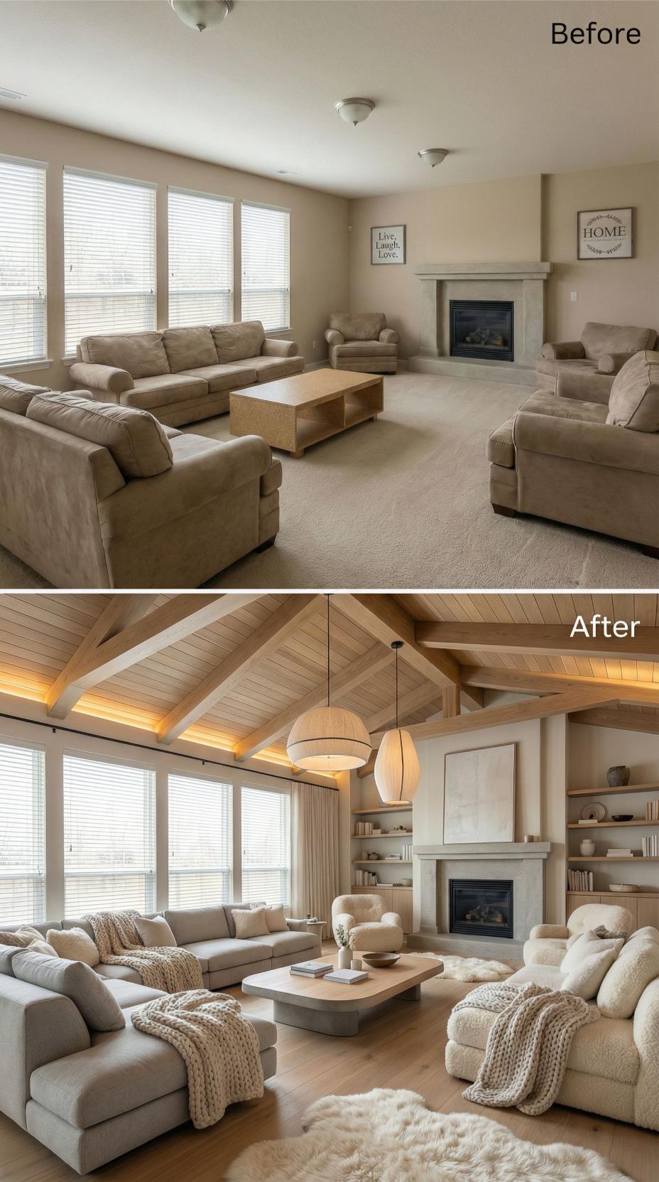 Stunning exposed wooden beams with integrated LED strip lighting create architectural interest that completely transforms this formerly bland space. Built-in shelving flanking the fireplace replaces empty walls, while layered neutral textures through chunky knit throws and plush area rugs add warmth. Strategic pendant lighting and curtain panels soften the windows, creating a sophisticated retreat from the previous cookie-cutter layout.