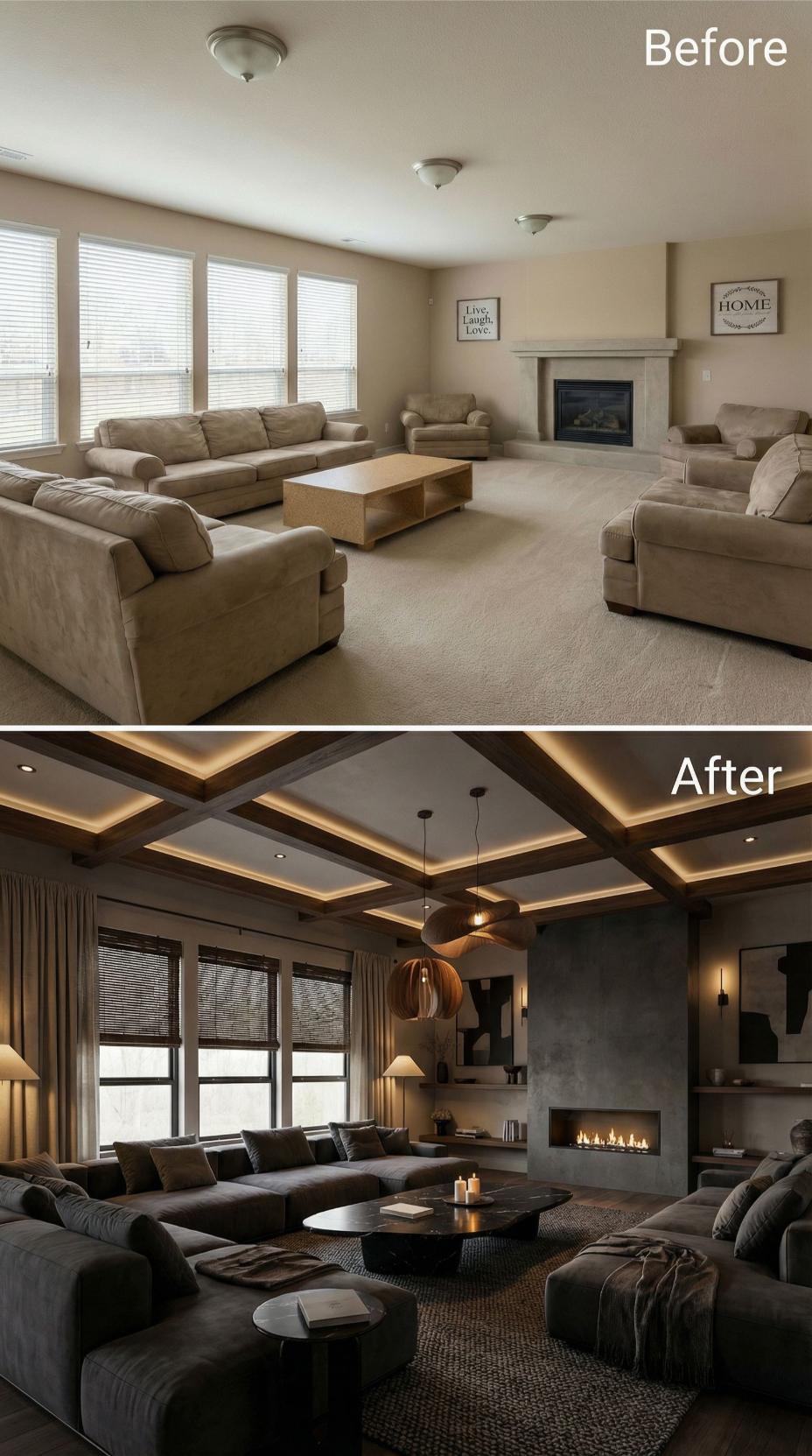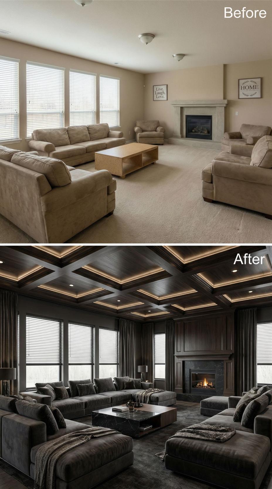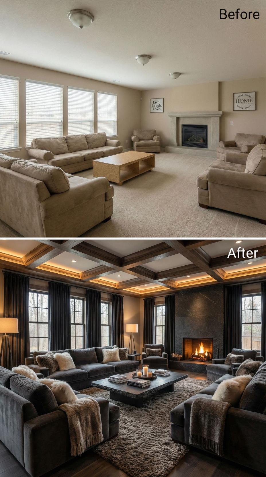 Bold transformation elevates this builder-grade living room for lazy people into a sophisticated retreat through rich charcoal walls and an elaborate coffered ceiling with warm LED strip lighting. Plush sectional seating in deep gray tones creates intimate conversation areas, while dark hardwood floors and layered window treatments replace bland carpet and basic blinds. The stone fireplace gains dramatic impact against moody paint colors.