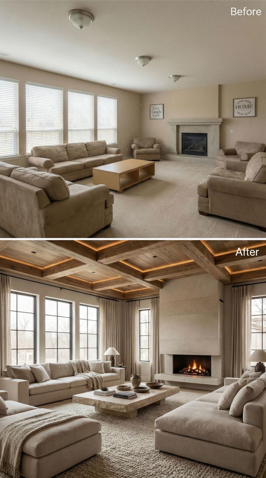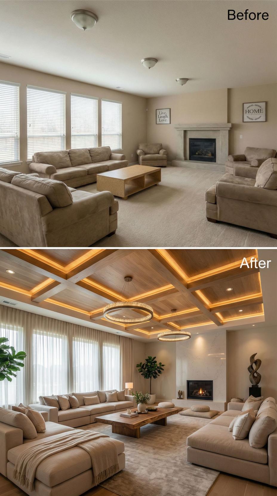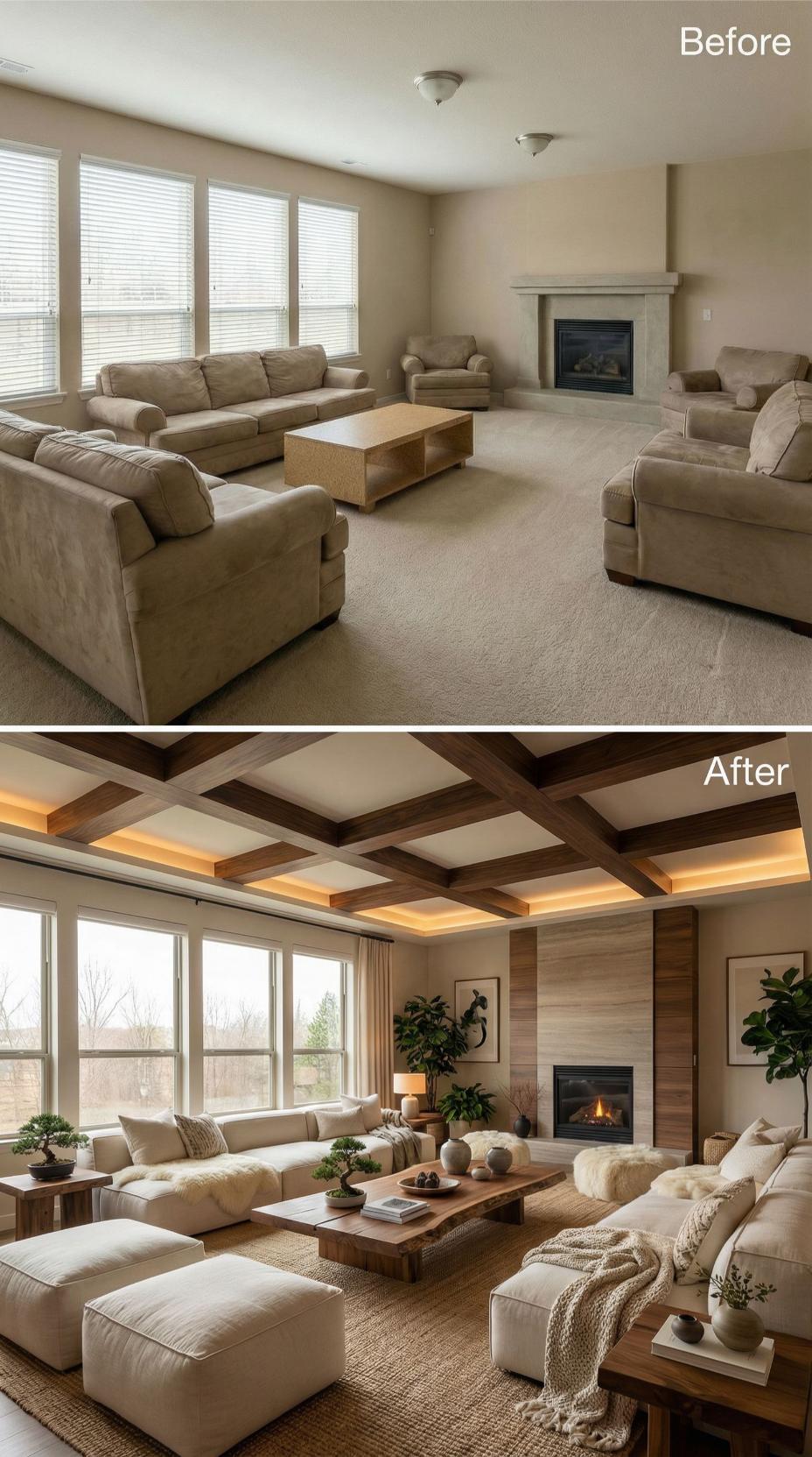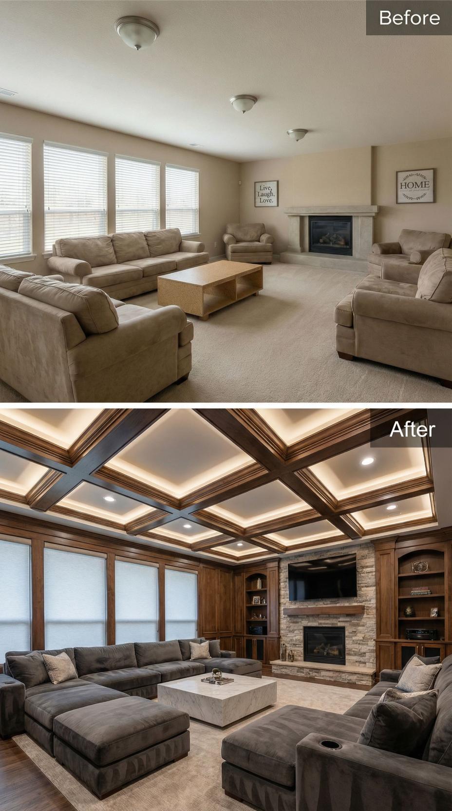 Dramatic geometric wood beams with integrated LED lighting completely revolutionize this once-bland builder-grade living room for lazy people. The stunning coffered ceiling creates architectural interest while warm lighting transforms the entire atmosphere. Stone fireplace surround, plush sectional seating, and layered textures elevate the space from basic to breathtaking without requiring major structural changes.
