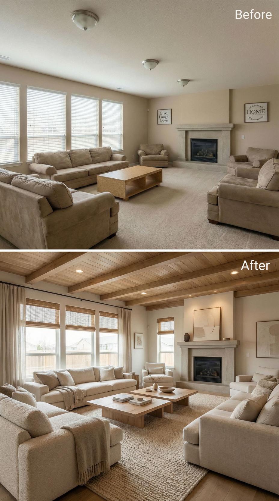 Exposed cedar ceiling beams completely revolutionize this builder-grade living room for lazy people, creating architectural interest without major construction. Natural woven bamboo shades replace basic blinds while flowing linen curtains soften the windows. The furniture arrangement remains similar, but thoughtful styling with neutral artwork, textured throws, and a jute area rug elevates the entire space into sophisticated rustic comfort.