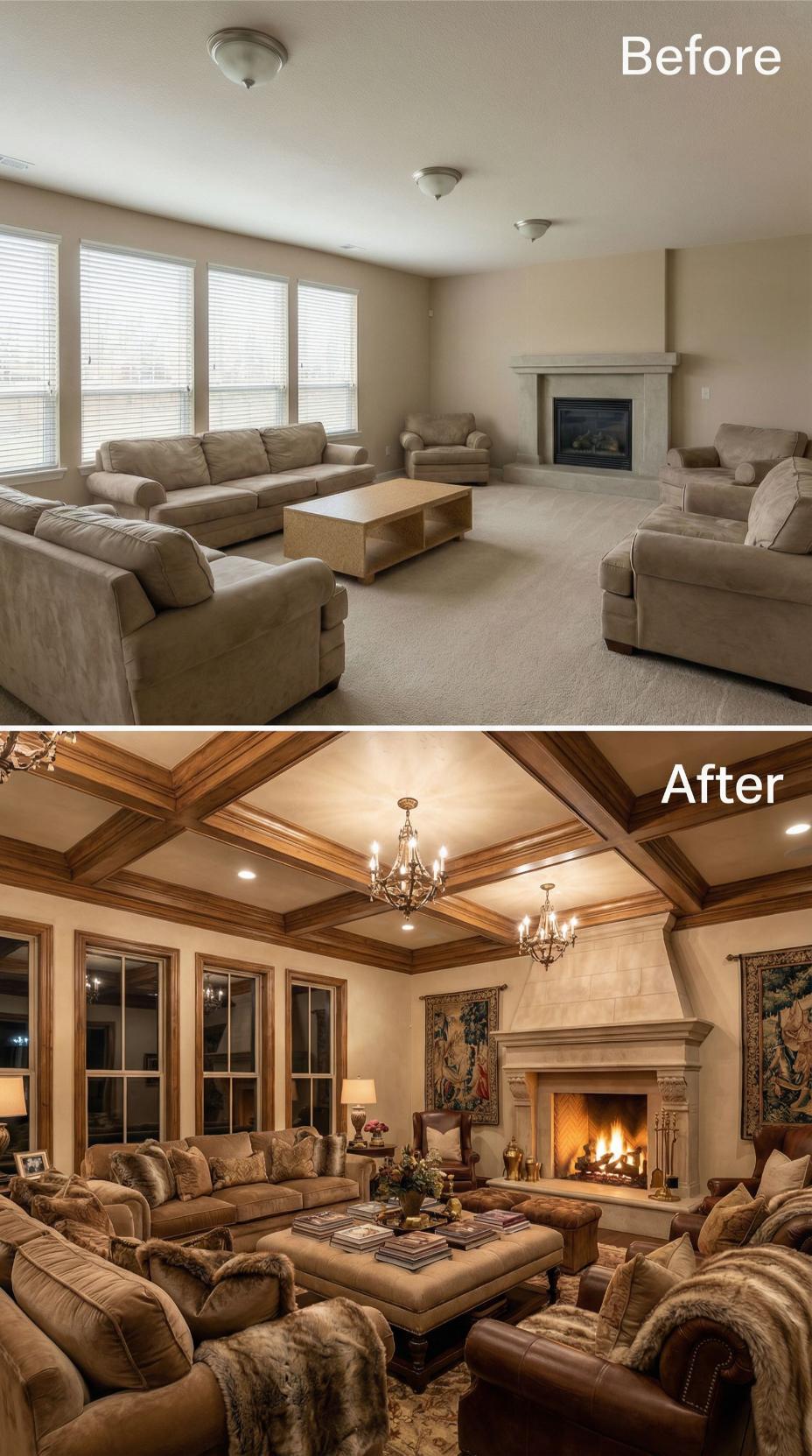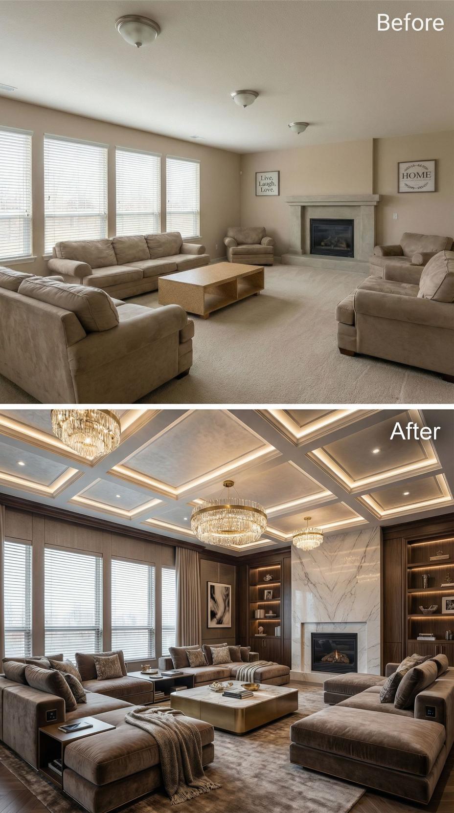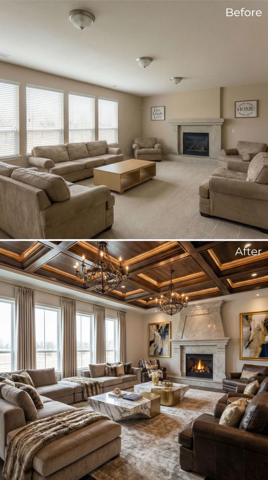 Elaborate coffered ceiling details with warm wood tones and integrated LED lighting transform this builder-grade living room for lazy people into a sophisticated retreat. Elegant chandeliers replace basic flush-mount fixtures while rich curtain panels frame the windows. The marble fireplace surround receives an upgrade, and a luxurious area rug anchors new furniture arrangements that create intimate conversation zones throughout the expansive space.