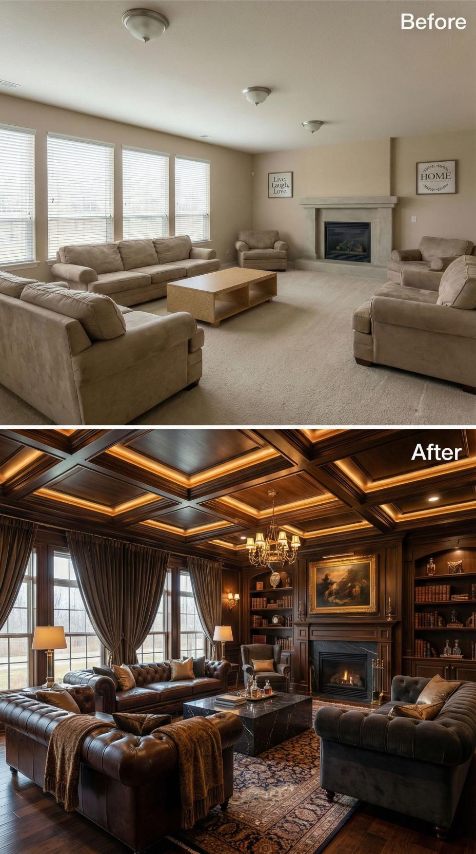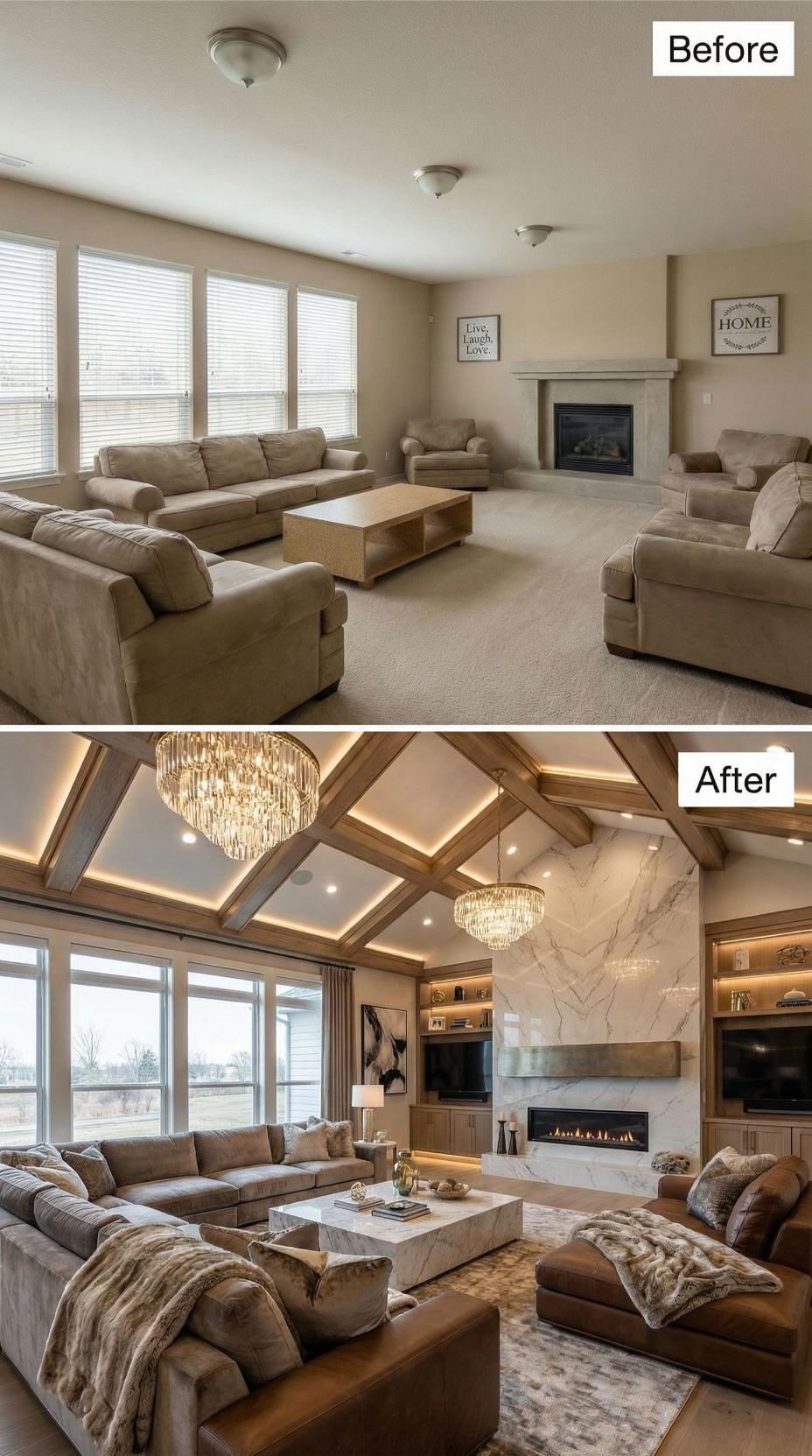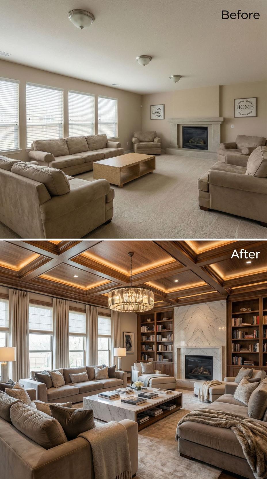 Elaborate coffered ceiling details with warm wood tones and integrated LED lighting transform this builder-grade living room for lazy people into a sophisticated retreat. Elegant chandeliers replace basic flush-mount fixtures while rich curtain panels frame the windows. The marble fireplace surround receives an upgrade, and a luxurious area rug anchors new furniture arrangements that create intimate conversation zones throughout the expansive space.