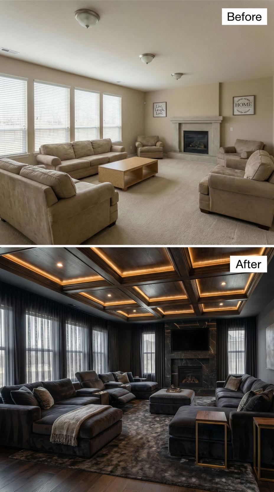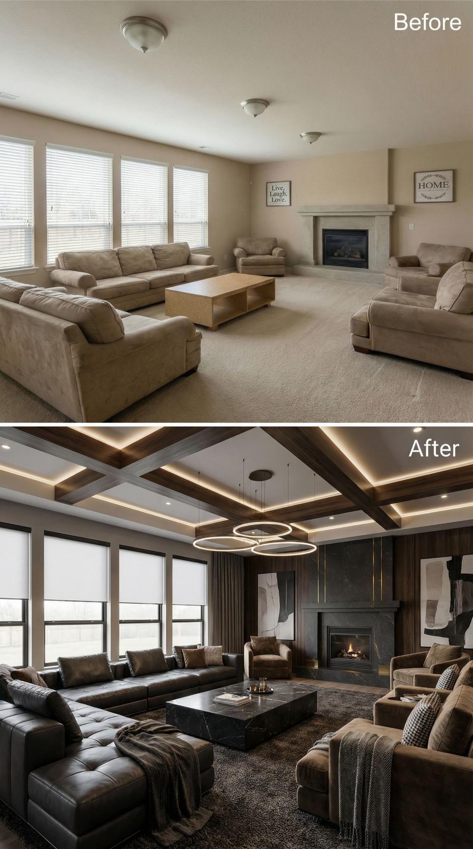 Bold architectural upgrades completely reimagine this builder-grade living room for lazy people through stunning coffered ceilings with integrated LED lighting. Rich charcoal furniture replaces beige basics, while luxurious textures and dramatic black window treatments create sophisticated contrast. Strategic lighting layers eliminate harsh overhead fixtures, transforming the space into an elegant retreat perfect for effortless entertaining.