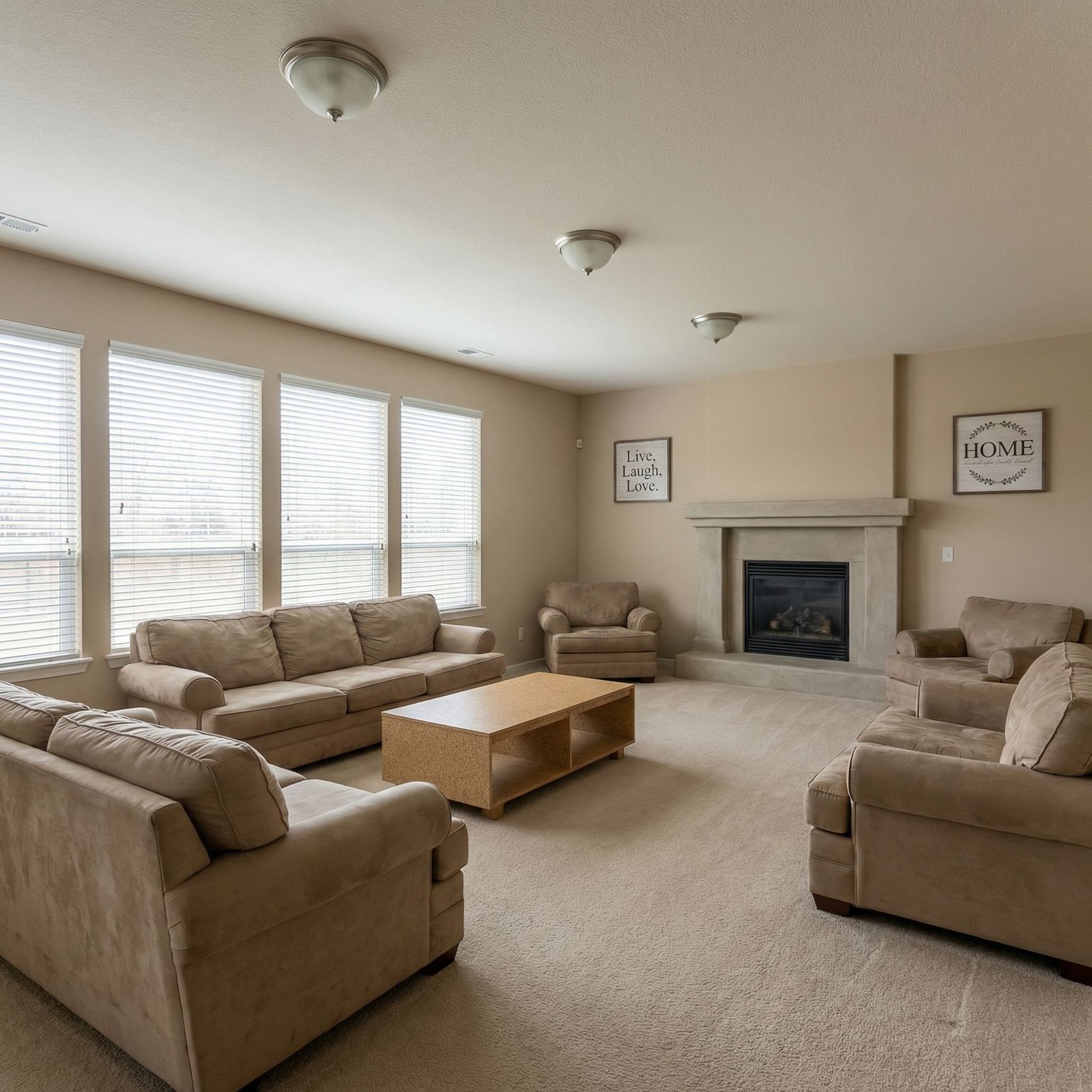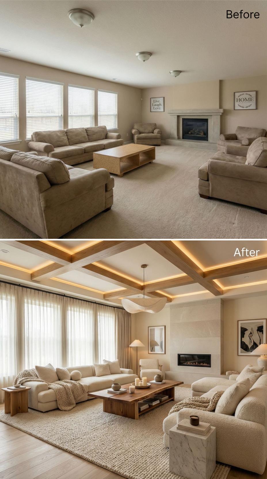 Dramatic coffered ceilings with warm LED strip lighting transform this previously basic space into an upscale retreat. Rich neutral furnishings replace the old mismatched seating arrangement, while flowing curtain panels soften the windows that once featured stark blinds. Layered textures through plush ottomans, throws, and a sophisticated area rug create the cozy luxury that builder-grade living rooms for lazy people desperately needed.