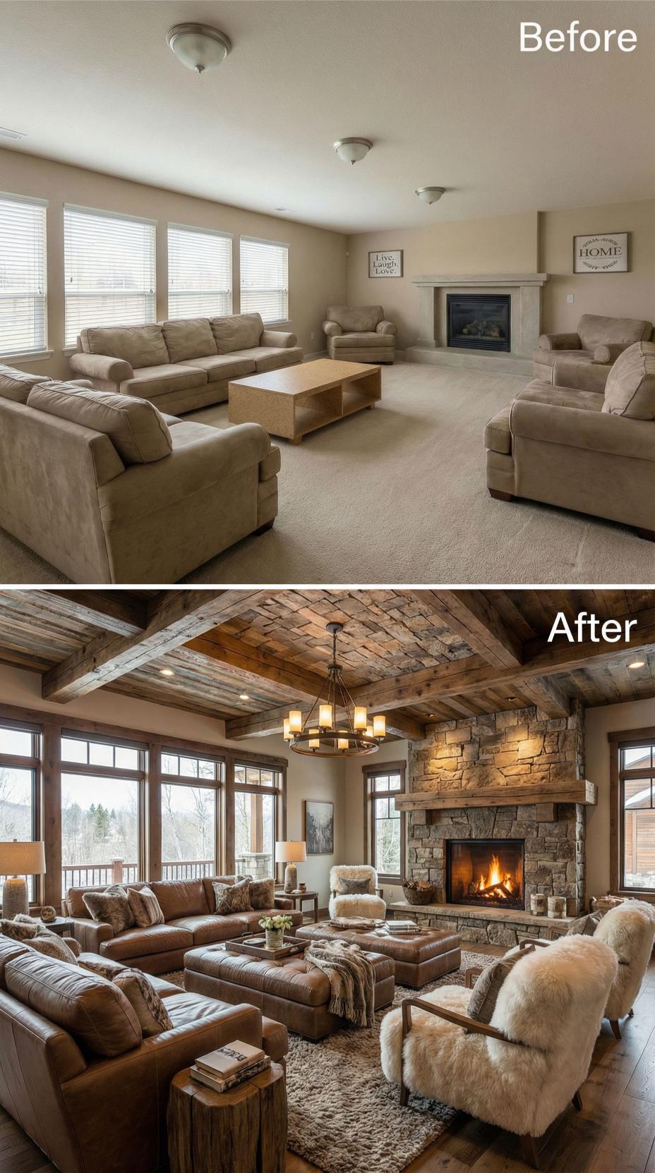Exposed wood beams and stacked stone completely transformed this builder-grade living room for lazy people into a sophisticated mountain retreat. Rich leather sectional seating replaces generic fabric furniture, while a dramatic stone fireplace with reclaimed wood mantel becomes the stunning focal point. Warm bronze lighting and natural textures create an inviting atmosphere that requires minimal maintenance yet delivers maximum impact.