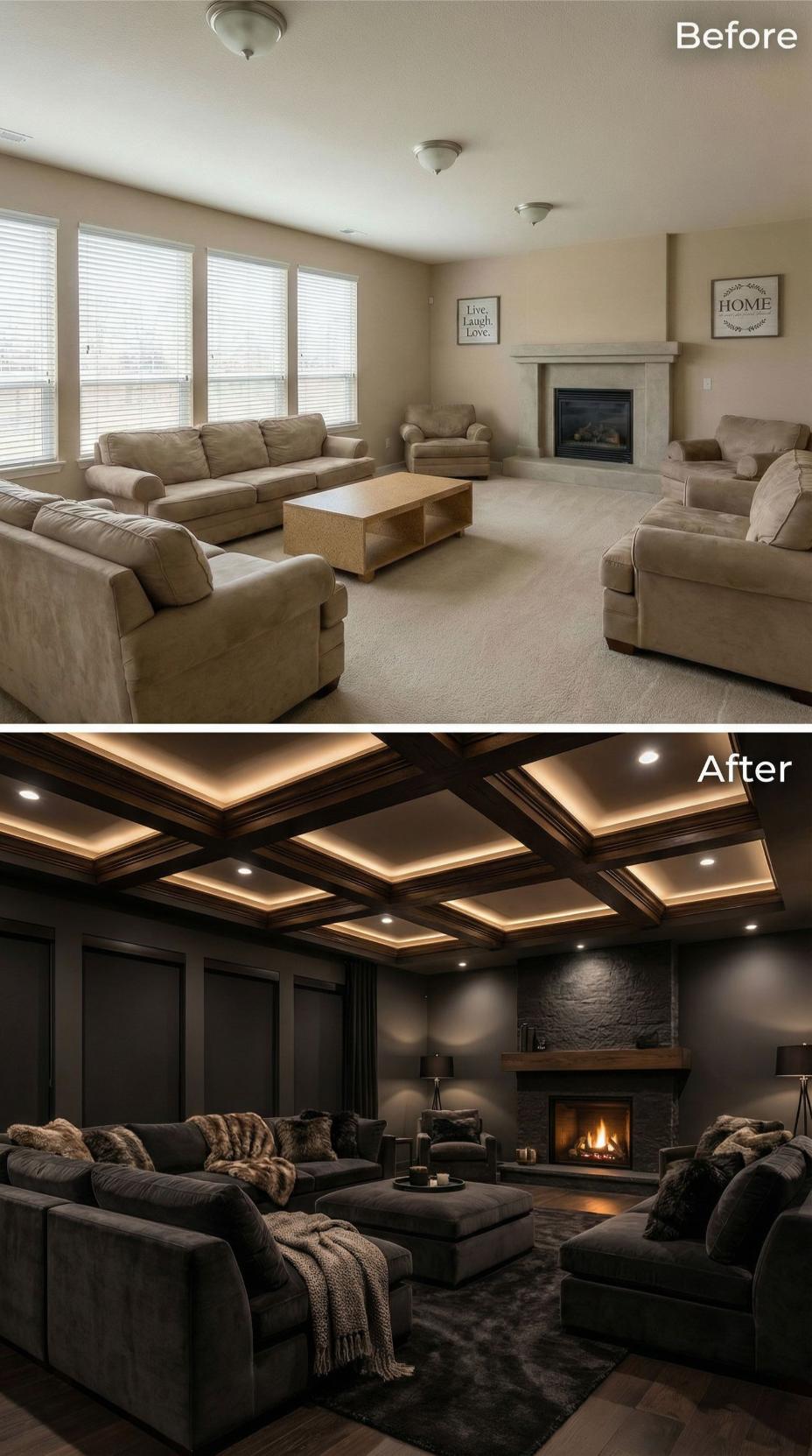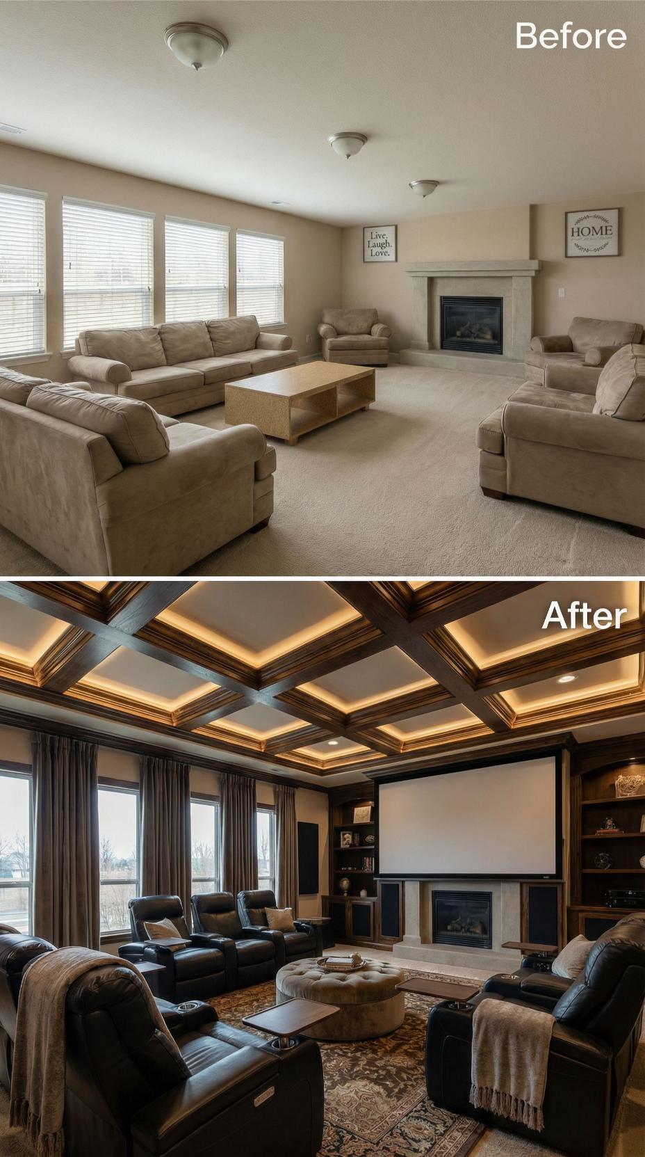 From Builder-Grade Bland to Luxurious Coffered Ceiling Theater Room