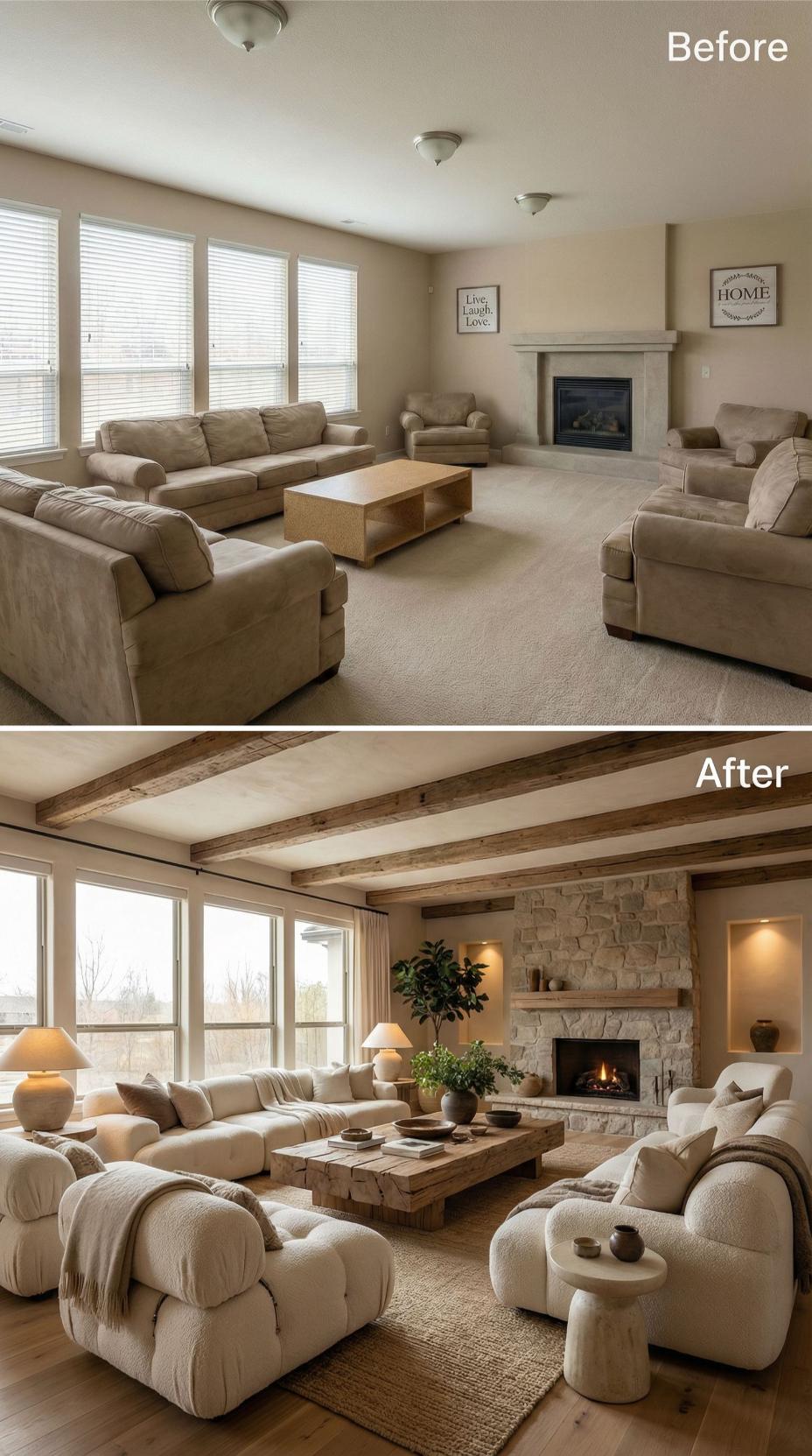 Exposed wooden ceiling beams instantly elevate this formerly bland space, while natural stone cladding transforms the basic fireplace into a stunning focal point. Plush cream sectional seating creates intimate conversation areas, complemented by warm lighting that banishes the sterile overhead fixtures. Natural textures through jute rugs and organic accessories complete the cozy yet sophisticated transformation.