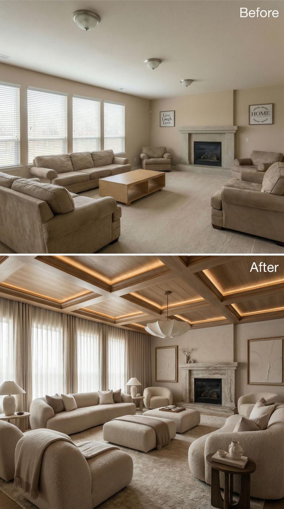 Dramatic coffered ceiling treatment with integrated LED strip lighting transforms this formerly flat space into an architectural showpiece. Natural wood paneling around the fireplace creates a stunning focal point, while the sectional sofa arrangement promotes intimate conversation. Layered textures through woven textiles, live greenery, and warm wood tones replace the monotonous beige palette that once dominated this builder-grade living room for lazy people.