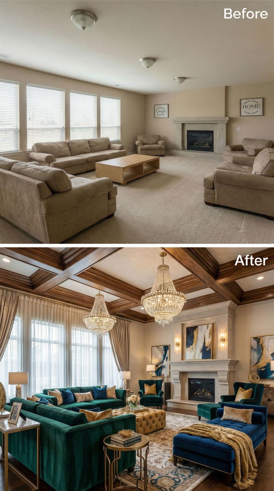 Two magnificent crystal chandeliers transform this bland builder-grade living room for lazy people into a luxurious entertaining space. Rich emerald velvet sectional seating replaces boring beige furniture, while coffered wood beam ceilings add architectural drama overhead. Elegant drapery panels frame the windows, and abstract artwork flanks the fireplace, creating sophisticated focal points that elevate the entire room’s aesthetic.