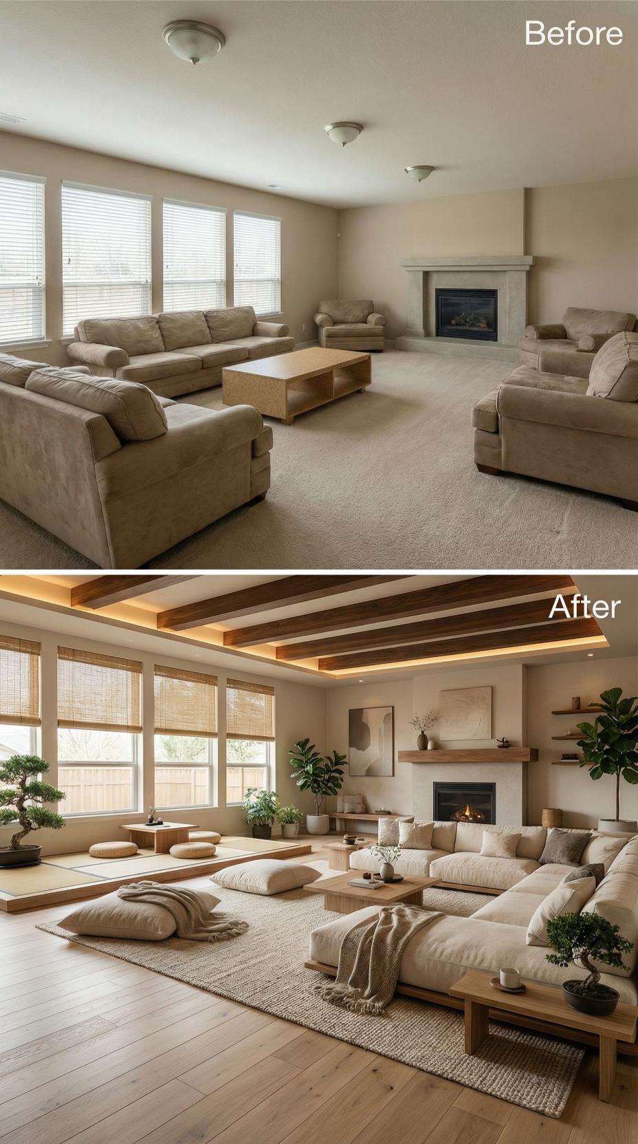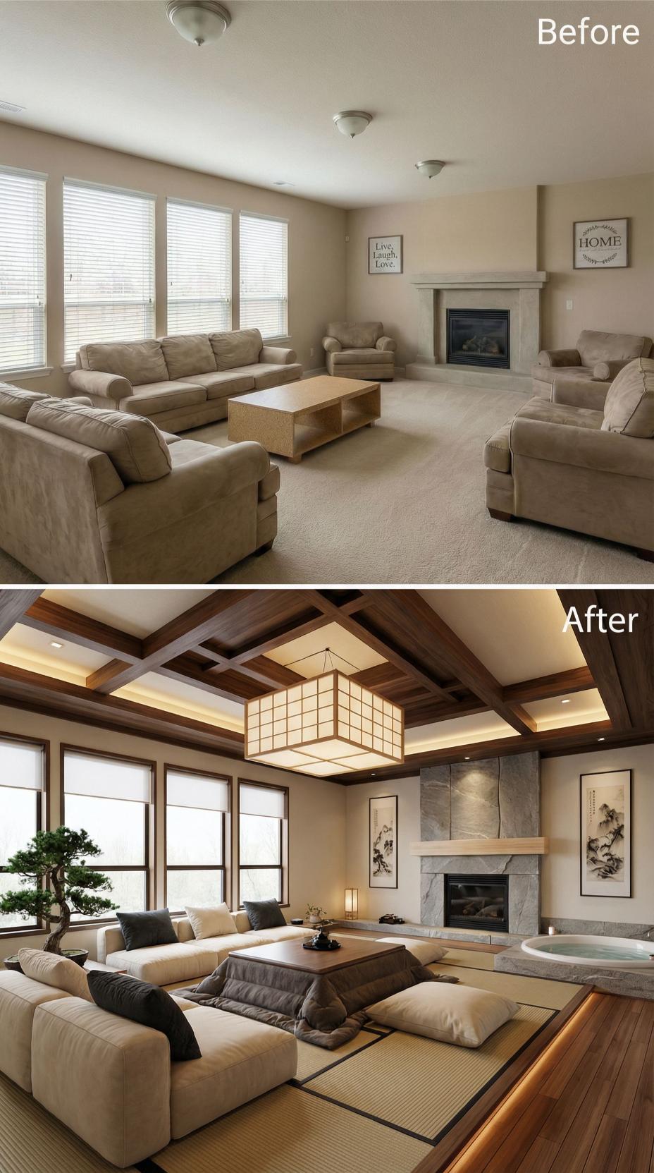 Exposed wooden ceiling beams and natural bamboo window shades replaced generic fixtures and plastic blinds in this stunning makeover. Floor cushions and low wooden platforms created an intimate conversation area where traditional furniture once dominated the space. Fiddle leaf fig plants and bonsai trees brought life to neutral walls, while warm wood tones throughout established a calming Japanese-inspired aesthetic.