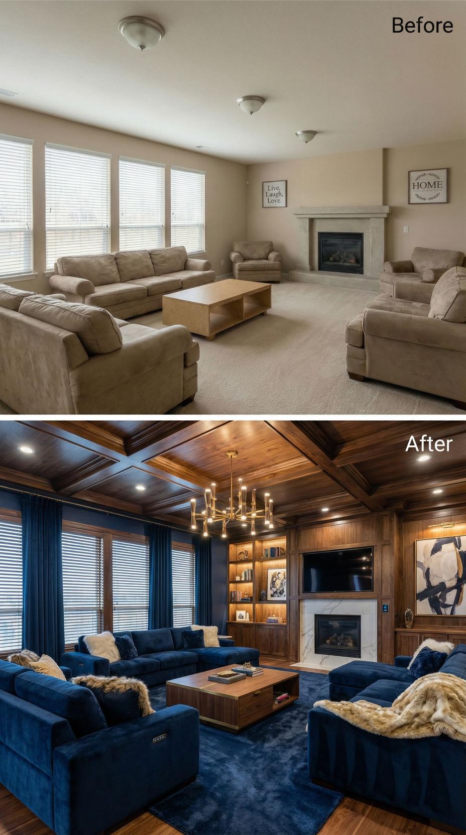 Bold navy velvet furniture completely revolutionizes this previously beige builder-grade living room for lazy people. Custom walnut built-ins with integrated lighting create dramatic storage around the fireplace, while coffered wood ceilings add architectural interest overhead. Deep blue area rugs and rich wood tones establish a masculine, club-like atmosphere that feels both luxurious and comfortable.