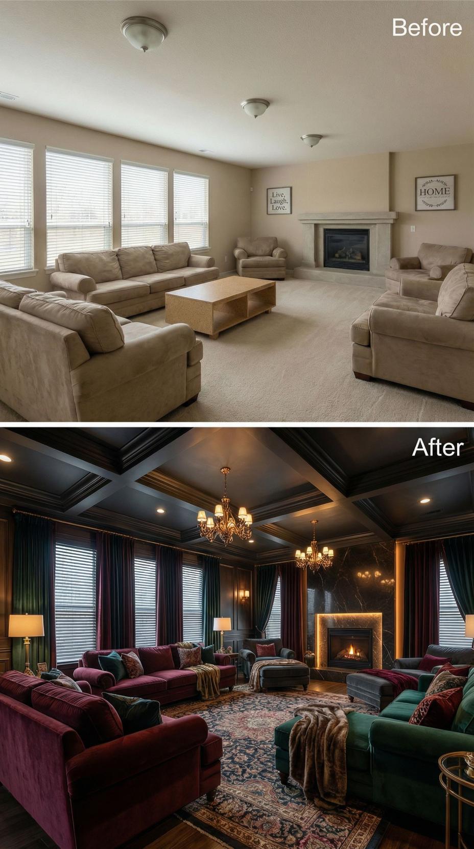 Deep jewel tones and luxurious textures completely revolutionize this once-neutral space into a sophisticated gentleman’s lounge. Rich burgundy velvet seating pairs with forest green accents, while ornate brass chandeliers replace basic ceiling fixtures. The dramatic coffered ceiling treatment and elegant window drapery elevate the room from forgettable builder-grade to unforgettable maximalist retreat.