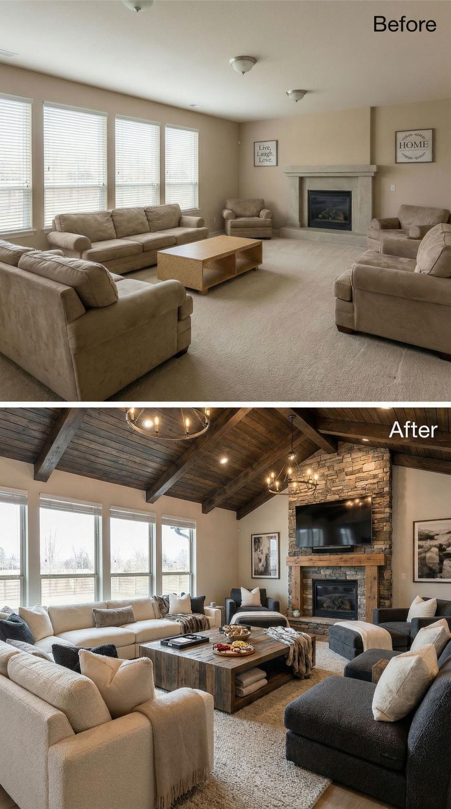 Exposed dark wood ceiling beams instantly elevate this formerly bland builder-grade living room into a sophisticated rustic modern retreat. Stone fireplace cladding replaces the basic surround while industrial chandeliers provide dramatic ambient lighting. Mixed textures through charcoal and cream seating arrangements create visual depth, while the reclaimed wood coffee table anchors the transformed space with authentic farmhouse character.