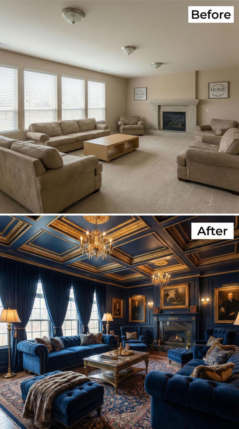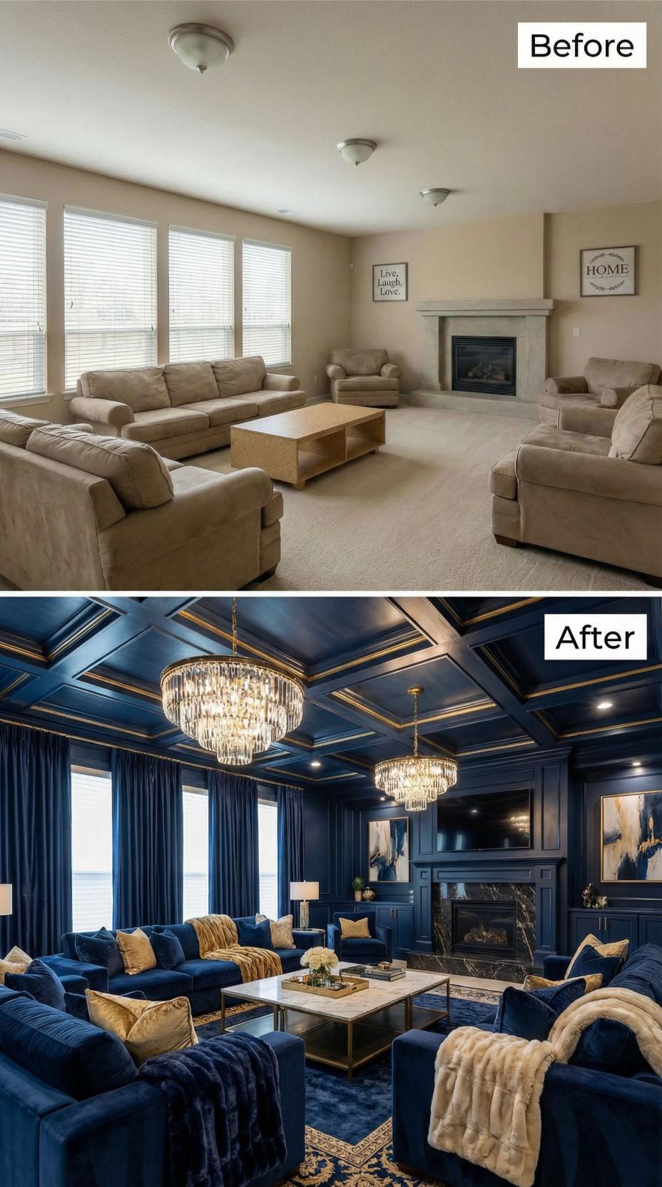 Bold navy blue walls and an ornate coffered ceiling with gold trim completely revolutionize this bland builder-grade living room for lazy people. Crystal chandeliers replace basic flush-mount fixtures while luxurious velvet sectionals in rich navy create intimate seating arrangements. Dramatic floor-to-ceiling curtains and metallic accents transform the ordinary space into a sophisticated, hotel-inspired retreat.
