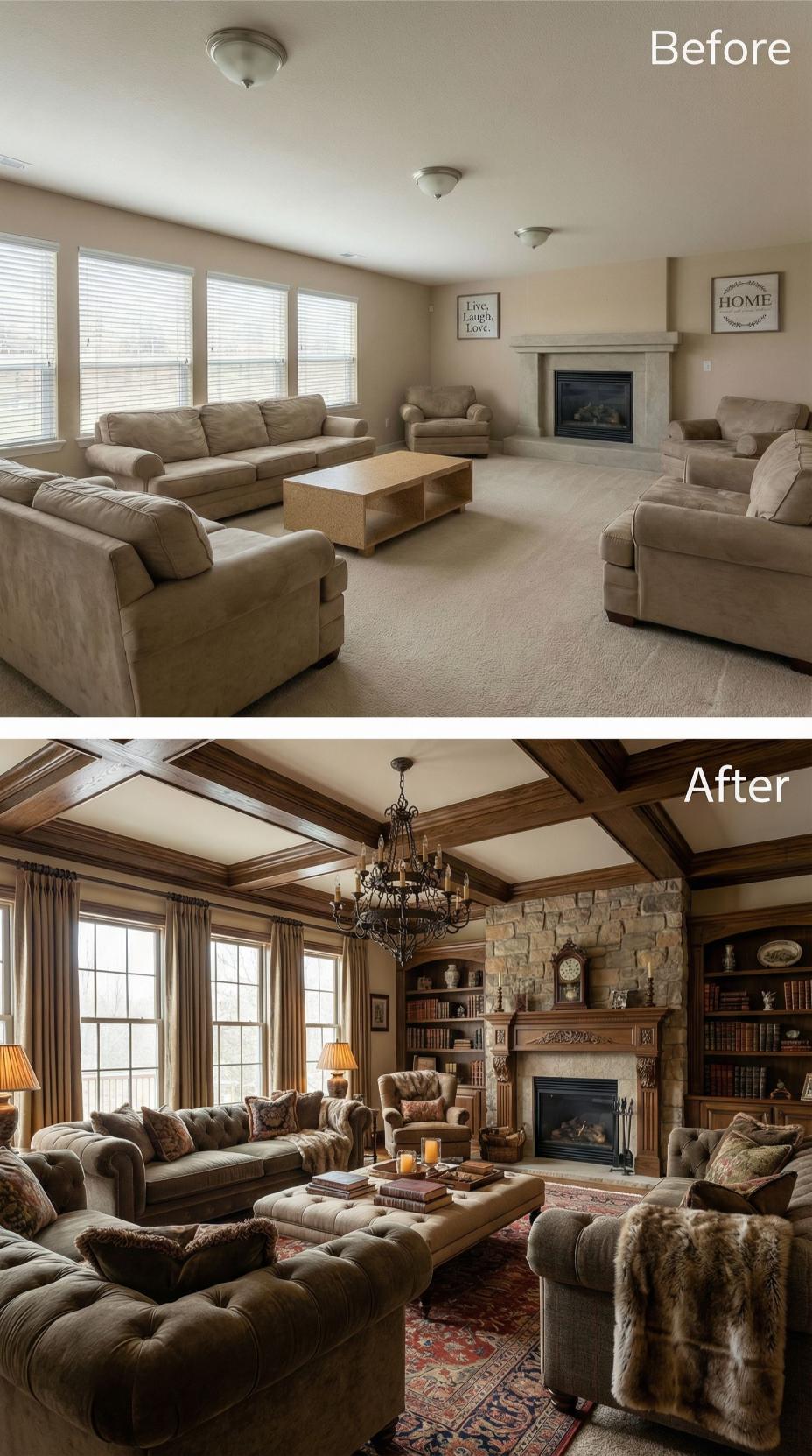 Elaborate wood beam coffering immediately elevates this formerly generic space into a sophisticated retreat. Rich walnut millwork creates architectural interest while dual bronze chandeliers replace basic flush mounts. The enhanced fireplace surround gains classical detailing, and luxurious tapestries replace bare walls. Plush ottoman seating and layered textures transform the sterile builder-grade living room into an inviting gentleman’s study.