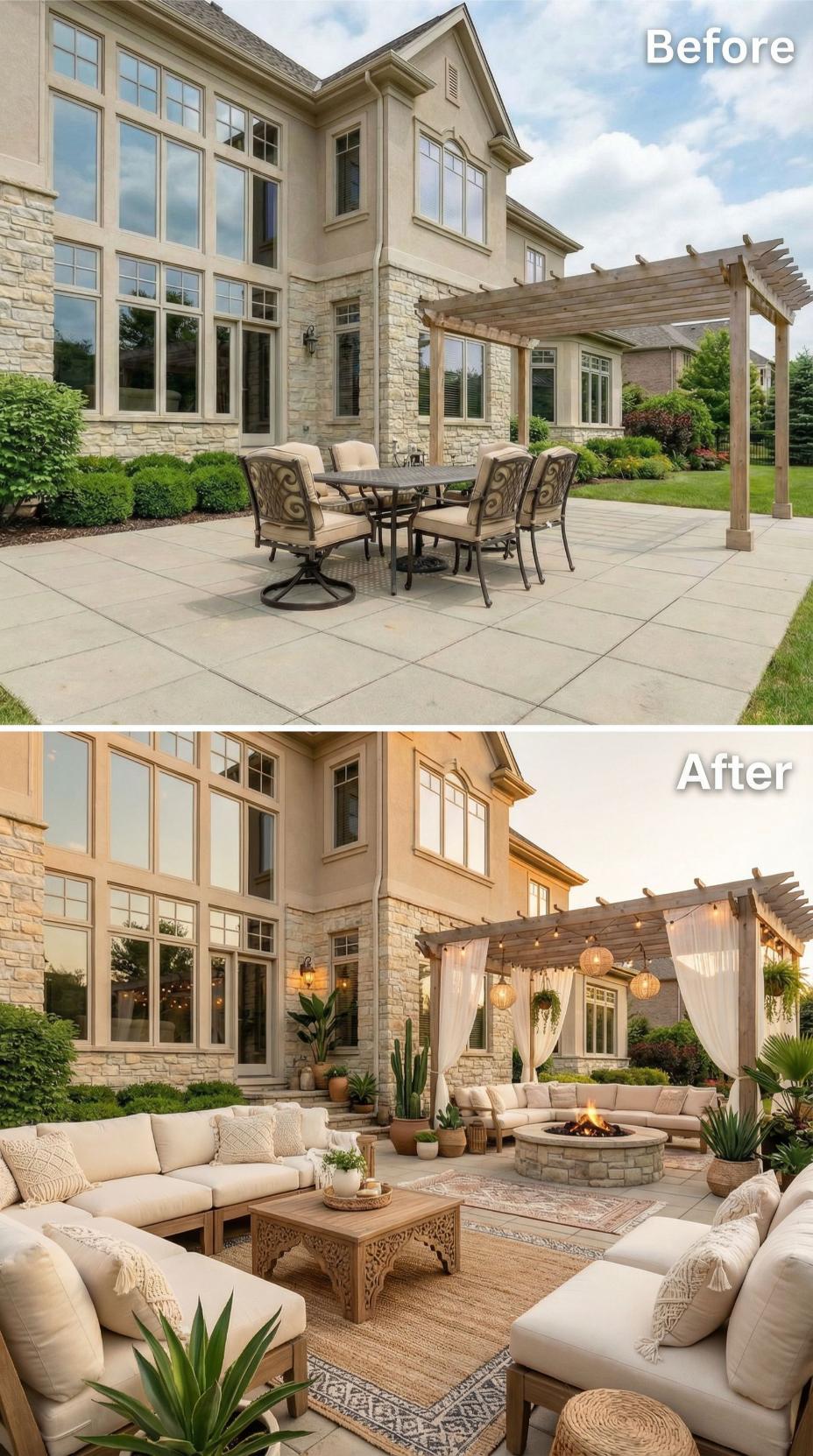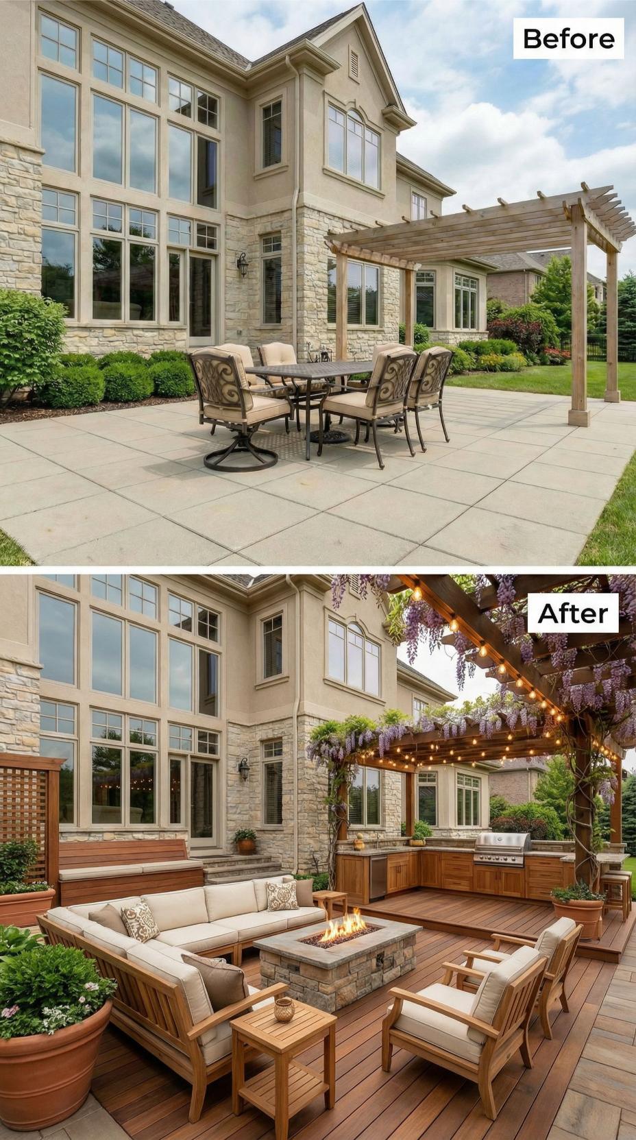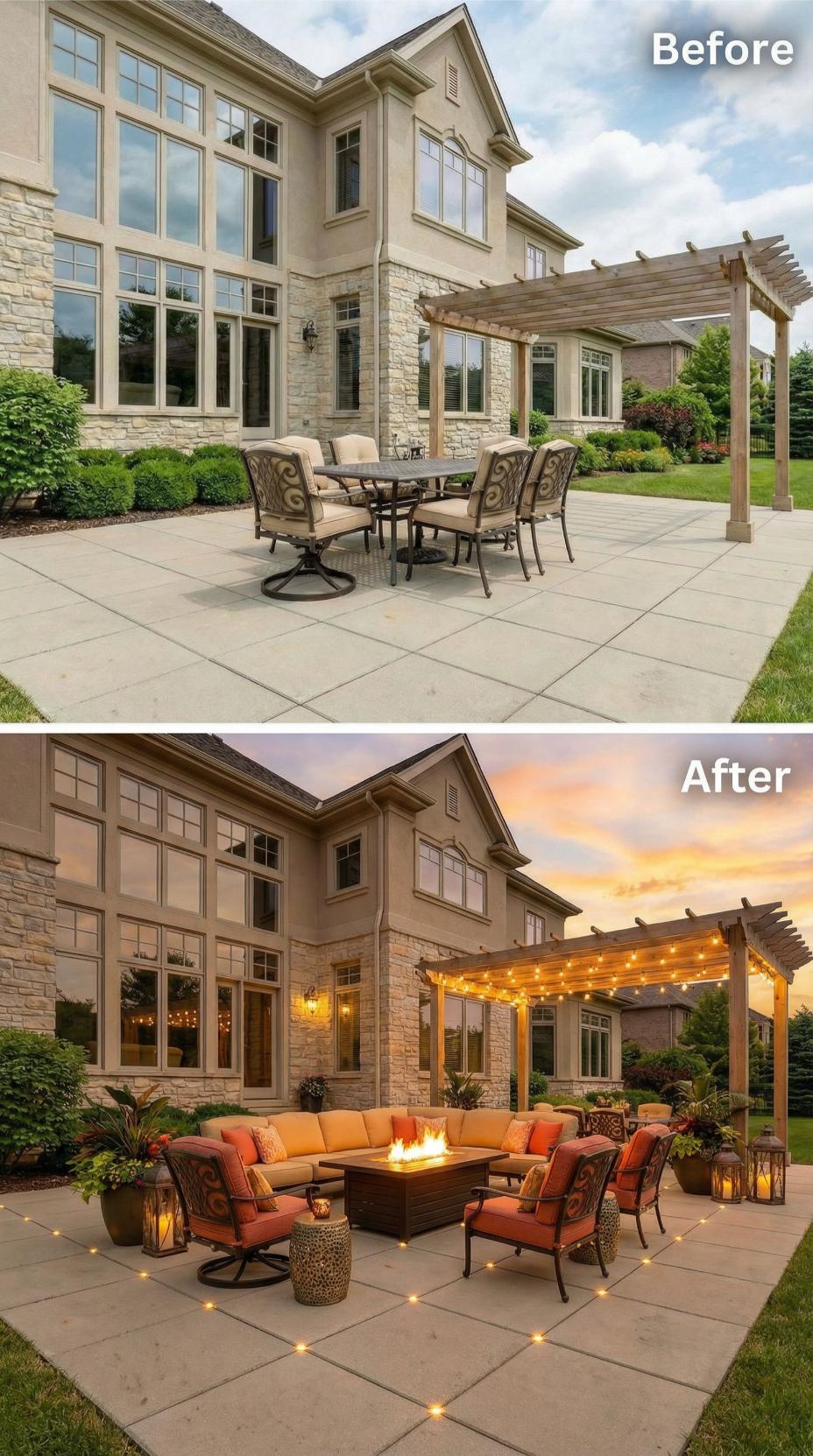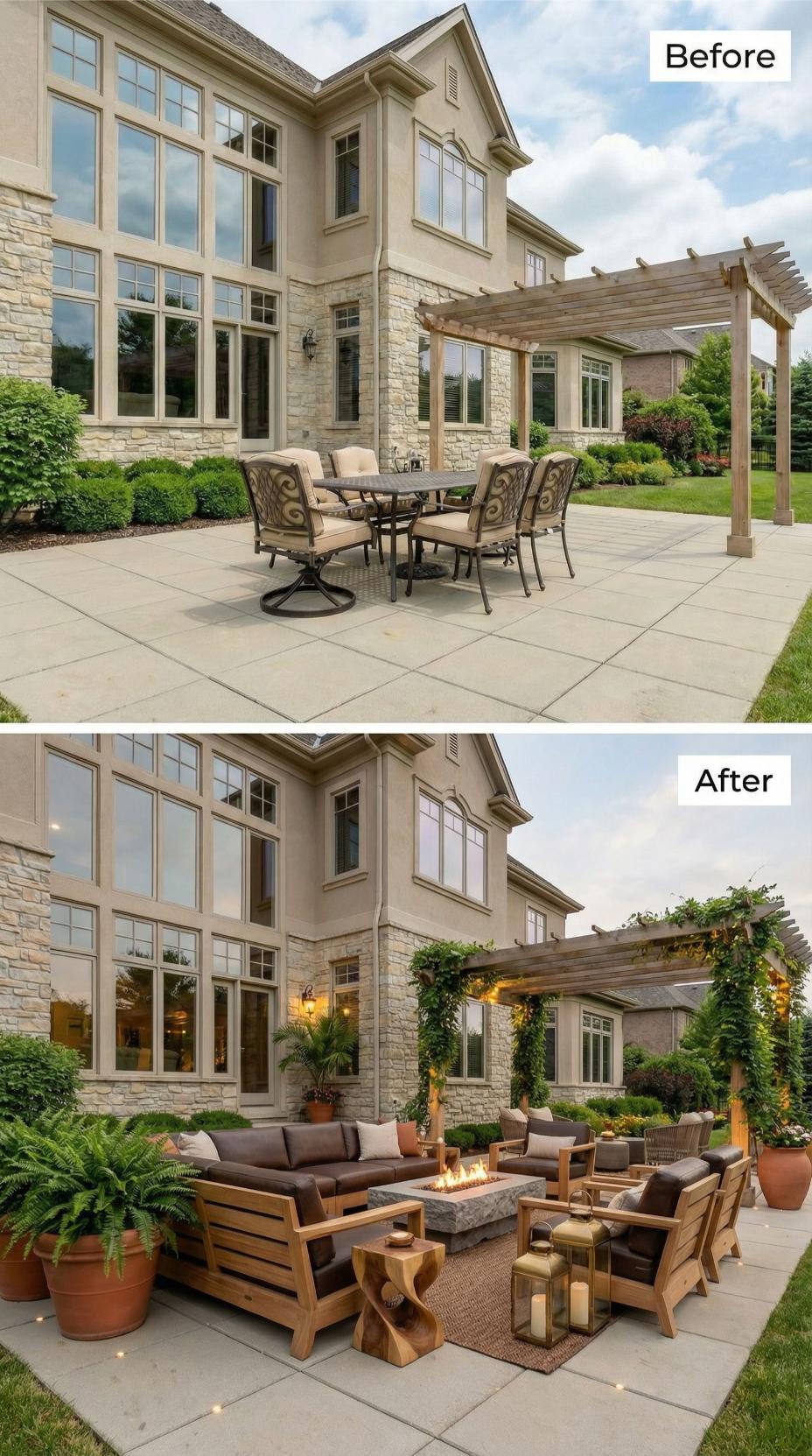 Builder-grade patios for happy people transform dramatically with thoughtful design choices and premium furnishings. The original space featured basic furniture and minimal styling, while the upgraded version showcases teak outdoor sectionals arranged around a sleek fire pit table. String lights create magical evening ambiance under the pergola, while large ceramic planters filled with tropical foliage add lush sophistication to every corner.