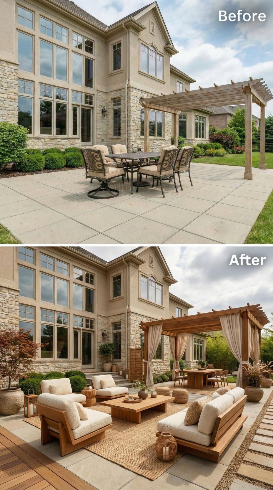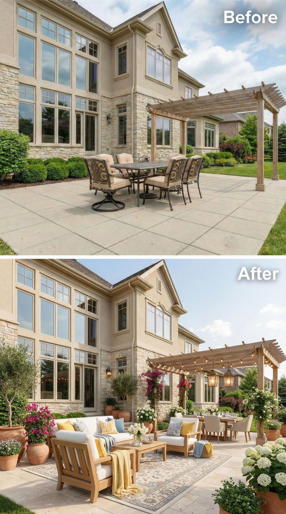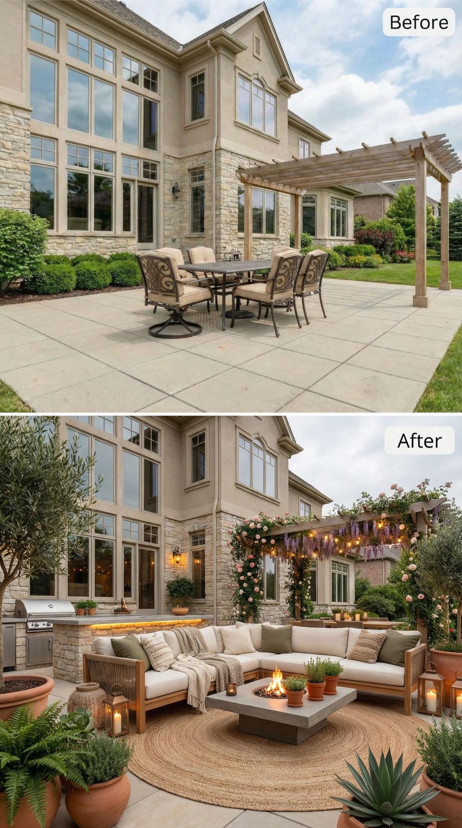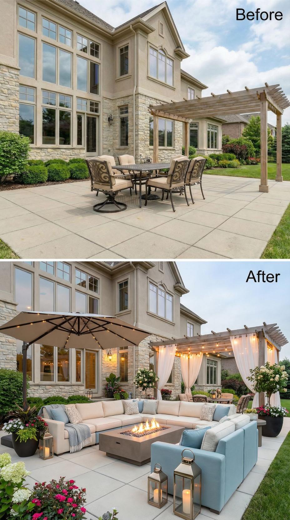 Builder-grade patios for happy people transform dramatically with thoughtful design choices and premium furnishings. The original space featured basic furniture and minimal styling, while the upgraded version showcases teak outdoor sectionals arranged around a sleek fire pit table. String lights create magical evening ambiance under the pergola, while large ceramic planters filled with tropical foliage add lush sophistication to every corner.
