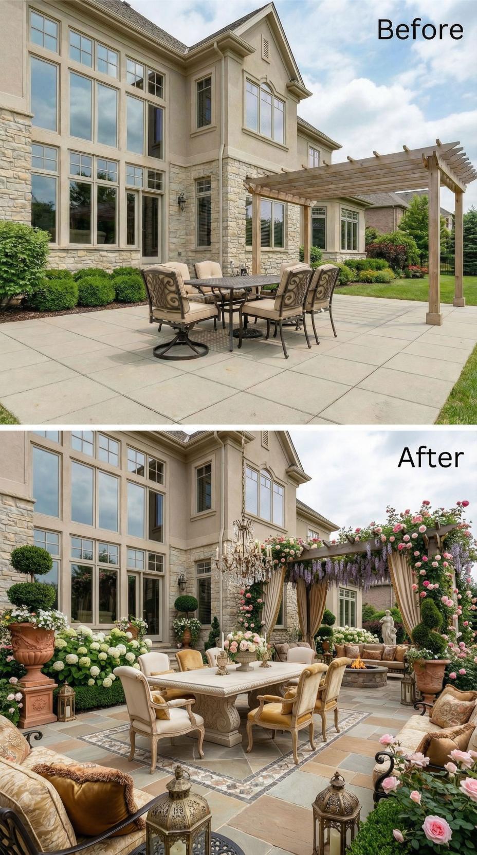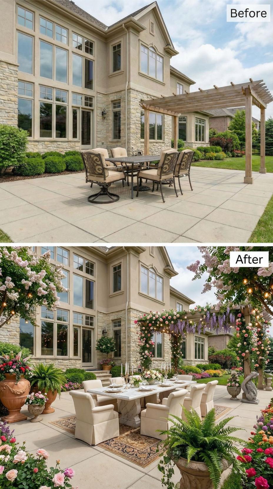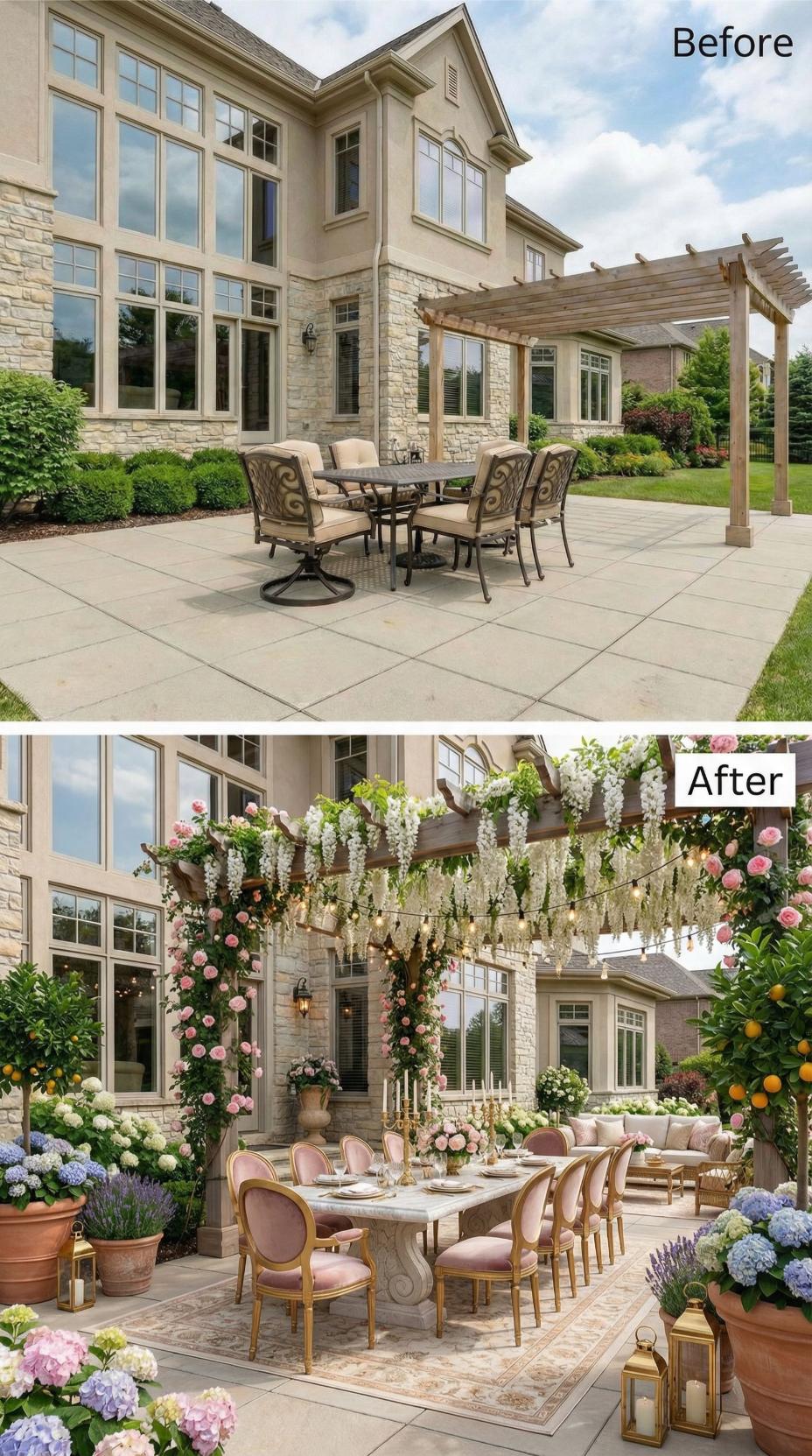 String lights and cascading wisteria transform this formerly stark patio into an enchanting outdoor dining destination. Pink upholstered chairs replace basic furniture while terracotta planters overflow with hydrangeas and climbing roses. The pergola gains romantic charm through abundant florals and warm lighting, creating an intimate garden party atmosphere that elevates everyday outdoor living.