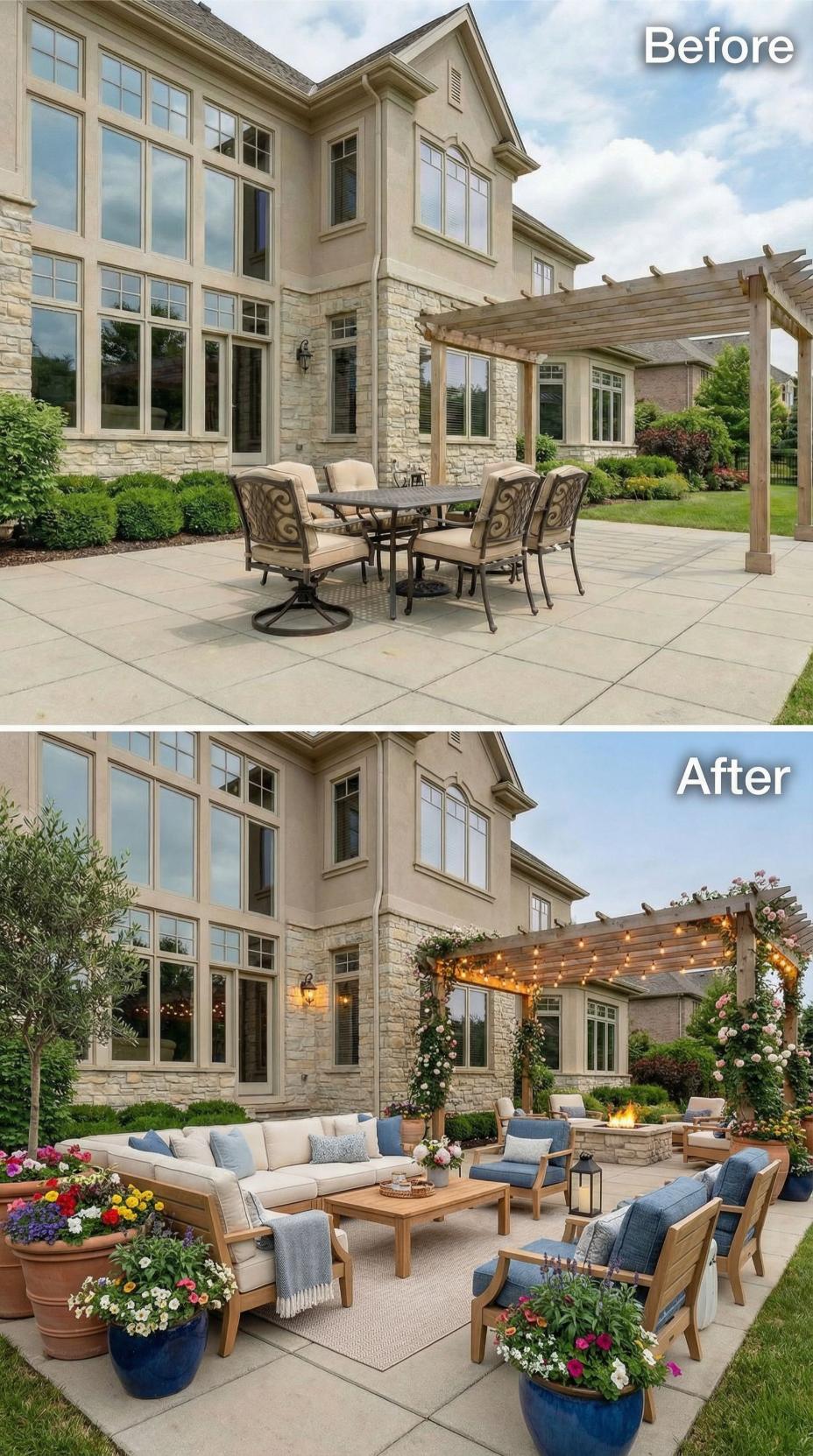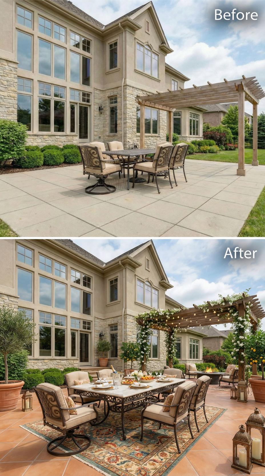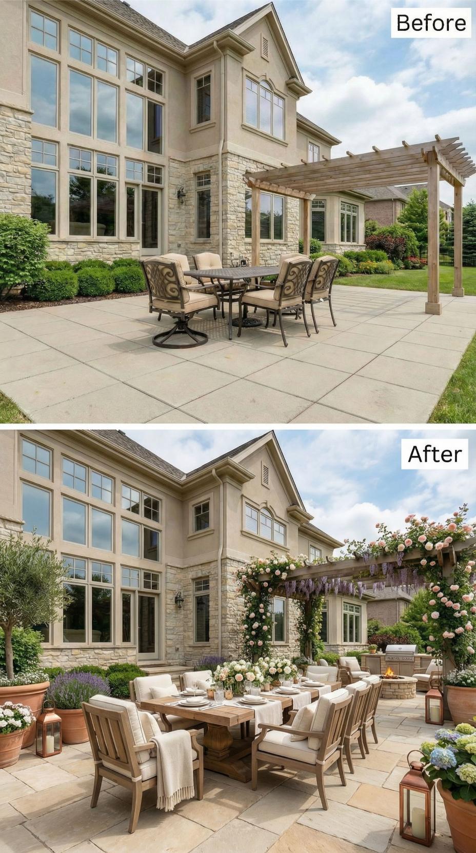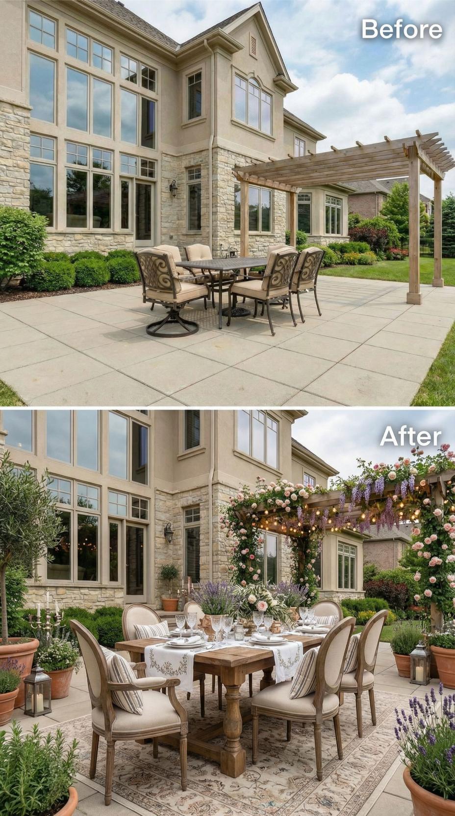 String lights and cascading wisteria transform this formerly stark patio into an enchanting outdoor dining destination. Pink upholstered chairs replace basic furniture while terracotta planters overflow with hydrangeas and climbing roses. The pergola gains romantic charm through abundant florals and warm lighting, creating an intimate garden party atmosphere that elevates everyday outdoor living.