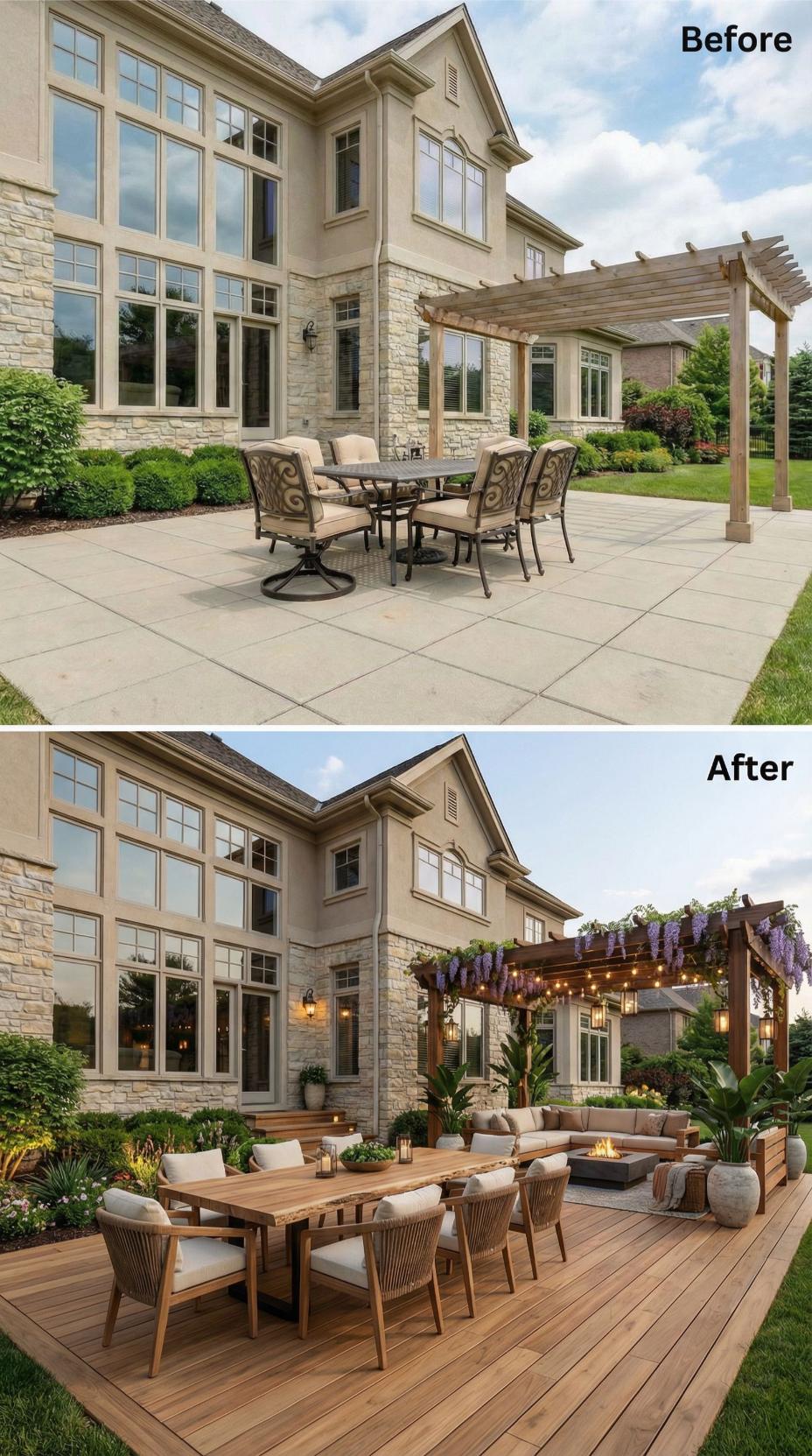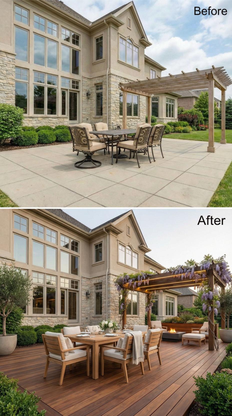 Builder-grade Patios for Happy People receive dramatic upgrades through rich teak decking and modern outdoor furniture. The transformation replaces bland concrete pavers with warm wood planking, while sleek teak dining sets and contemporary pergolas create sophisticated entertaining zones. Wisteria-draped structures and integrated fire features elevate the space from basic to resort-worthy, proving that thoughtful material choices and strategic furniture placement can completely reimagine outdoor living areas.