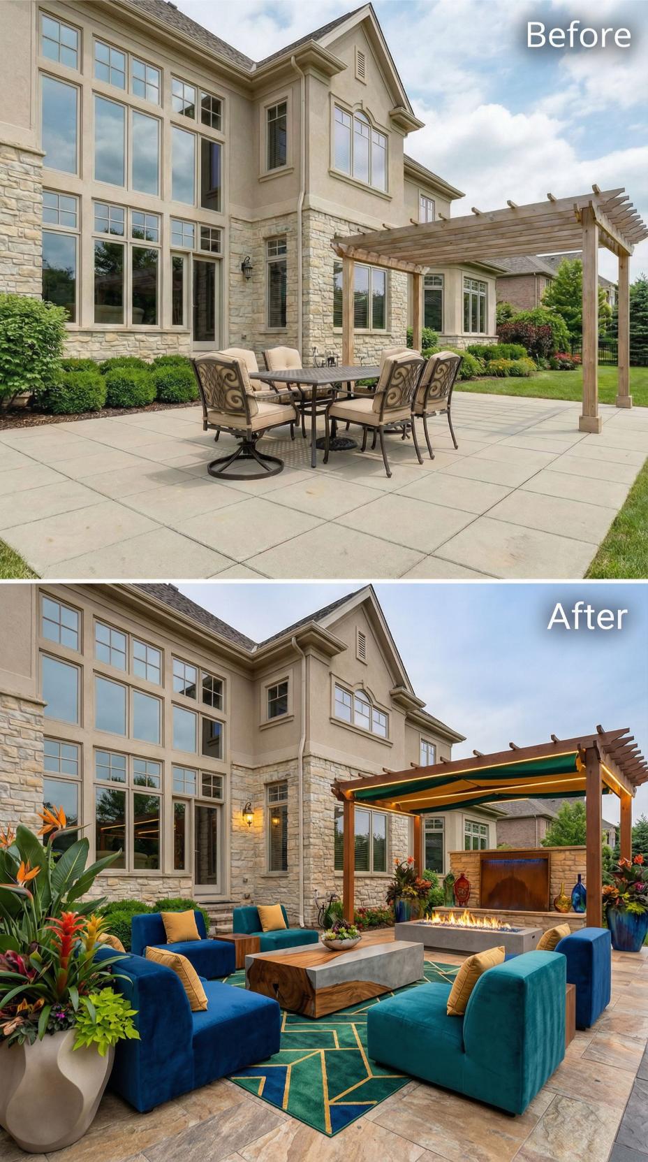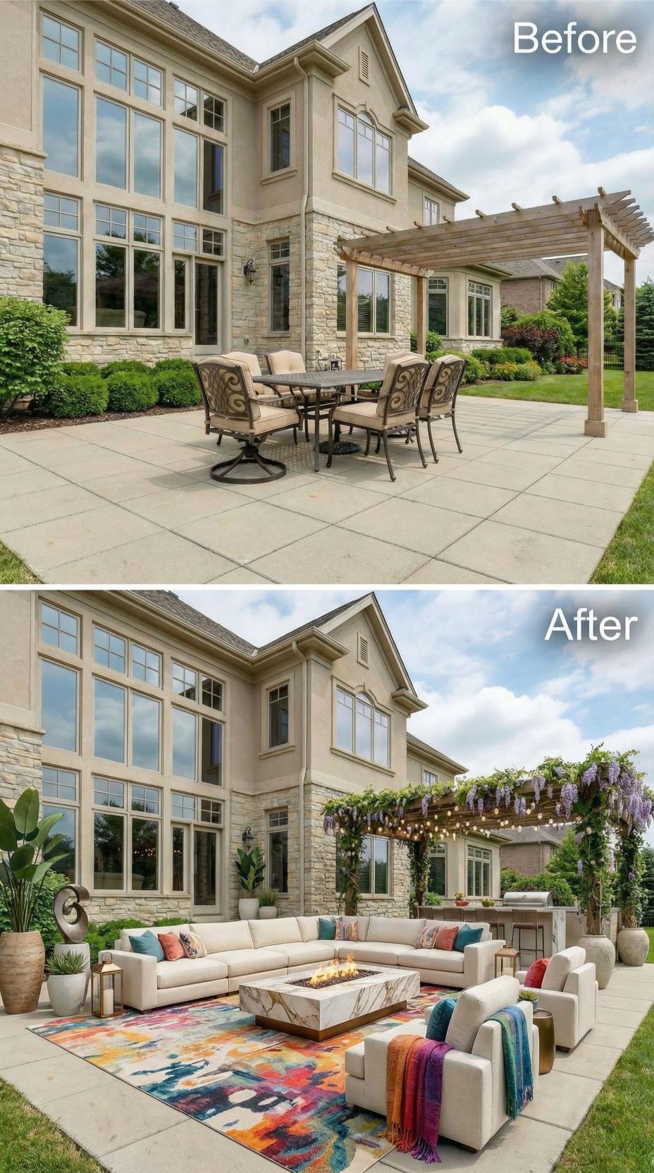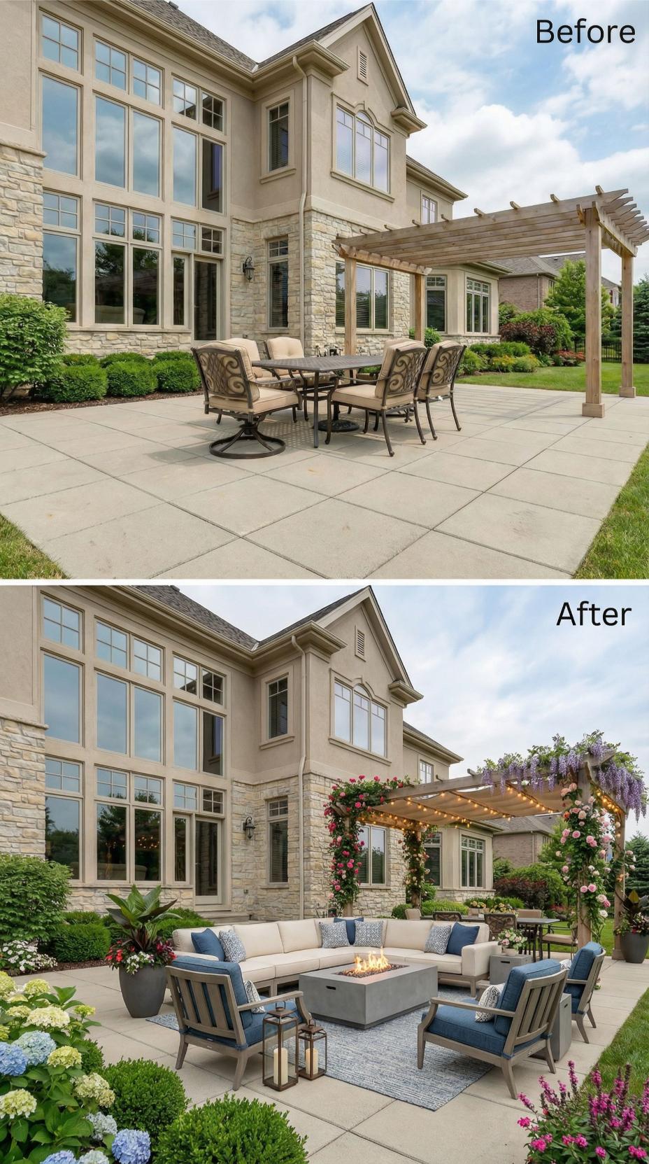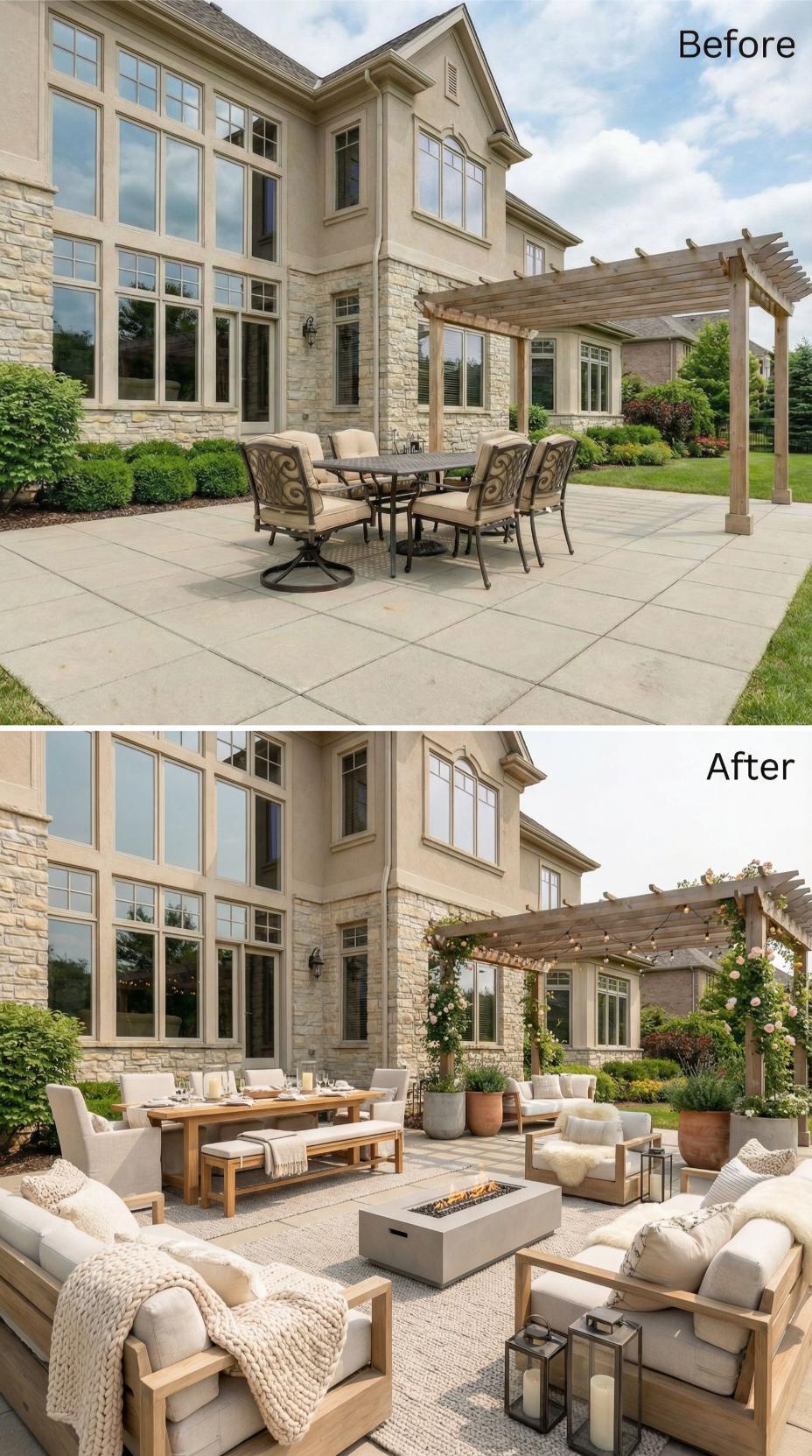 Builder-grade patios for happy people evolve dramatically when thoughtful zoning replaces sparse furniture arrangements. The transformation introduces a stone fire pit as the centerpiece, surrounded by curved sectional seating that encourages intimate conversations. Strategic planters and colorful cushions add warmth and personality, while string lights draped across the pergola create magical evening ambiance that transforms ordinary outdoor space into an inviting retreat.