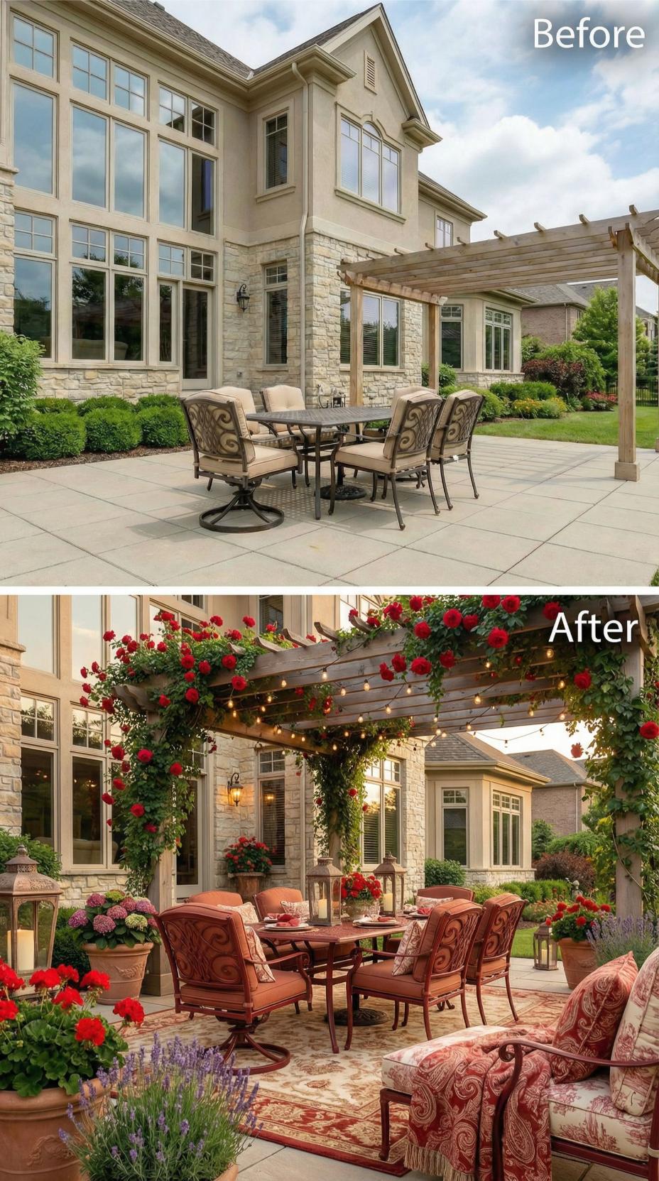 Dramatic climbing roses transform a basic pergola into an enchanting outdoor dining room, while string lights add magical evening ambiance. The makeover replaces standard patio furniture with a natural teak dining set positioned perfectly under the blooming canopy. Colorful planters filled with vibrant annuals create garden-like borders, elevating this builder-grade patio into a romantic entertaining space worthy of special occasions.