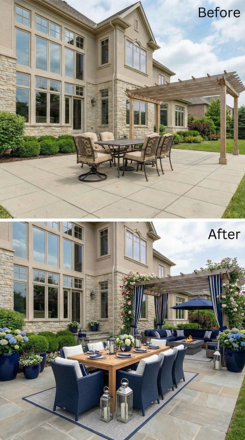 Bold navy blue transforms this outdoor dining area from basic to breathtaking, replacing beige furniture with sophisticated wicker seating and a stunning teak dining table. Coordinating blue planters filled with white hydrangeas frame the space while striped curtains on the pergola add resort-worthy privacy. Strategic placement of lanterns and a cohesive color palette elevate this builder-grade patio into an elegant entertaining destination.