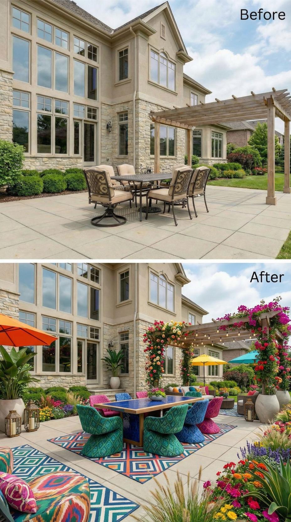 Bold jewel-toned velvet chairs transform this outdoor dining space from bland to brilliant. Colorful geometric patterns dance across area rugs while climbing bougainvillea creates natural purple canopies overhead. String lights add magical evening ambiance, while vibrant planters burst with tropical foliage and seasonal blooms throughout the redesigned patio.