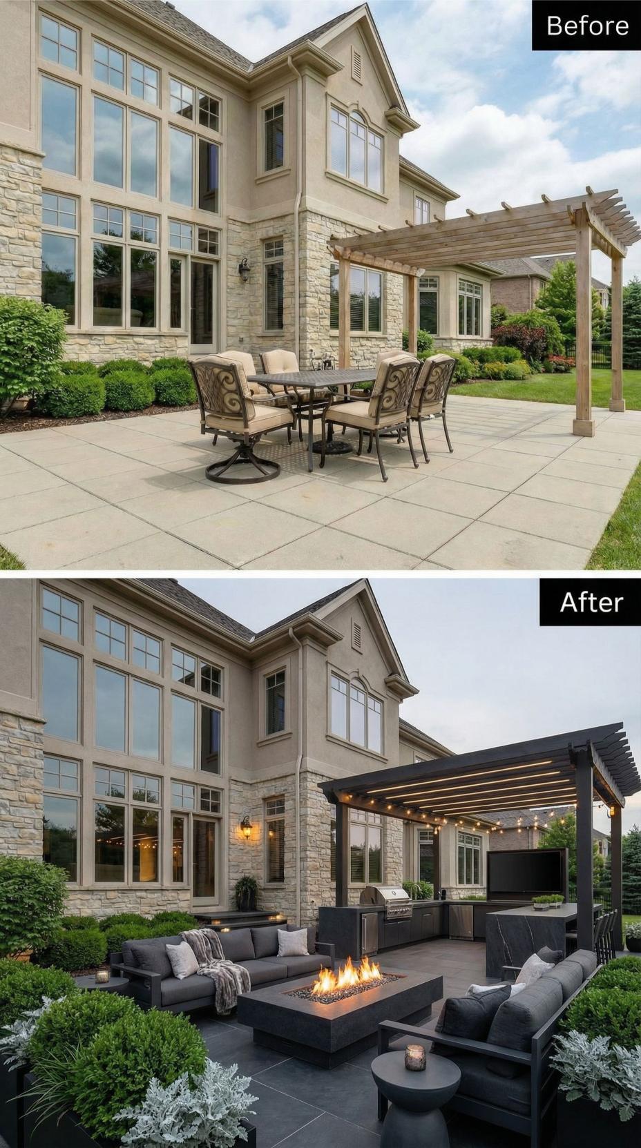 Bland beige concrete transforms into a sophisticated entertaining oasis with dramatic black steel pergola, sleek charcoal outdoor sectionals, and striking linear fire feature. Dark stone flooring replaces basic pavers while string lighting adds warmth overhead. Built-in outdoor kitchen with stainless appliances elevates functionality. Lush plantings soften hard edges, creating intimate zones for relaxation and dining in this stunning metamorphosis.