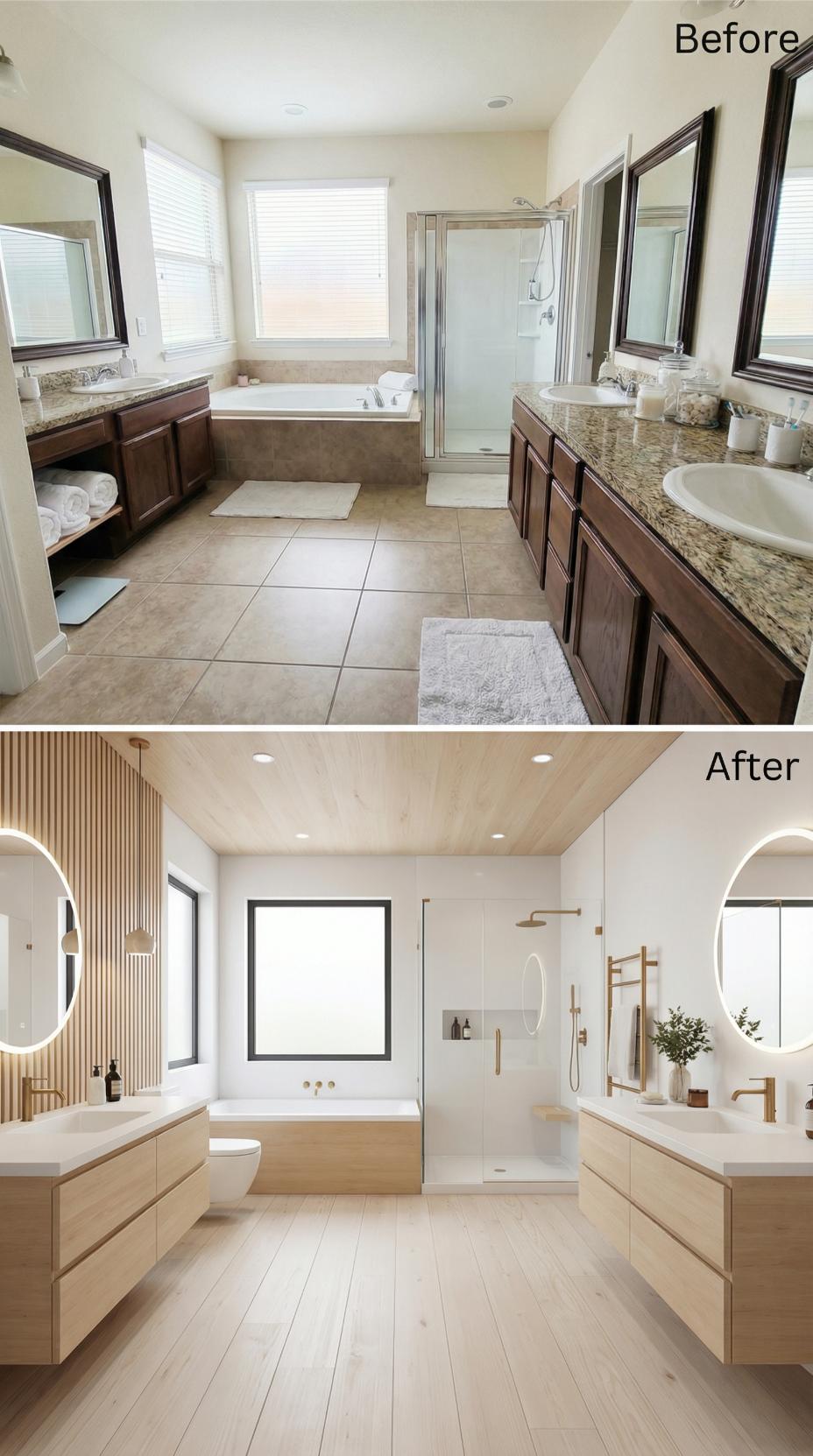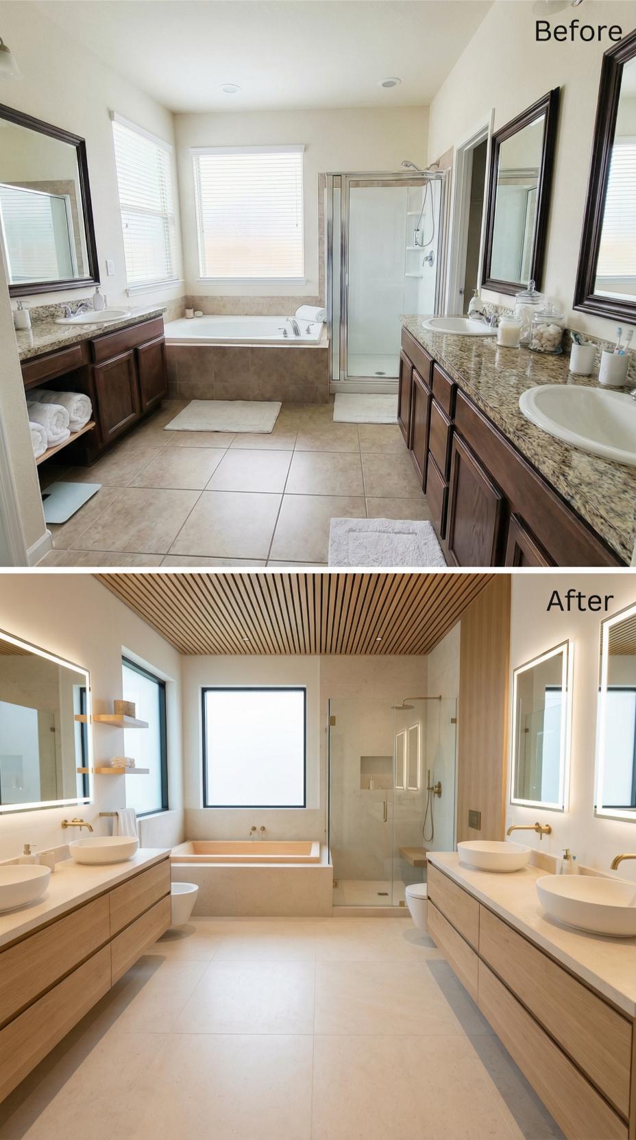 Warm wood tones and clean lines transform this cluttered builder-grade primary bathroom into a serene wellness retreat. Floating vanities replace bulky cabinetry while vertical wood slats create stunning textural contrast against crisp white walls. The redesigned layout eliminates visual chaos through streamlined fixtures, integrated storage, and a cohesive neutral palette that promotes both relaxation and easy maintenance.