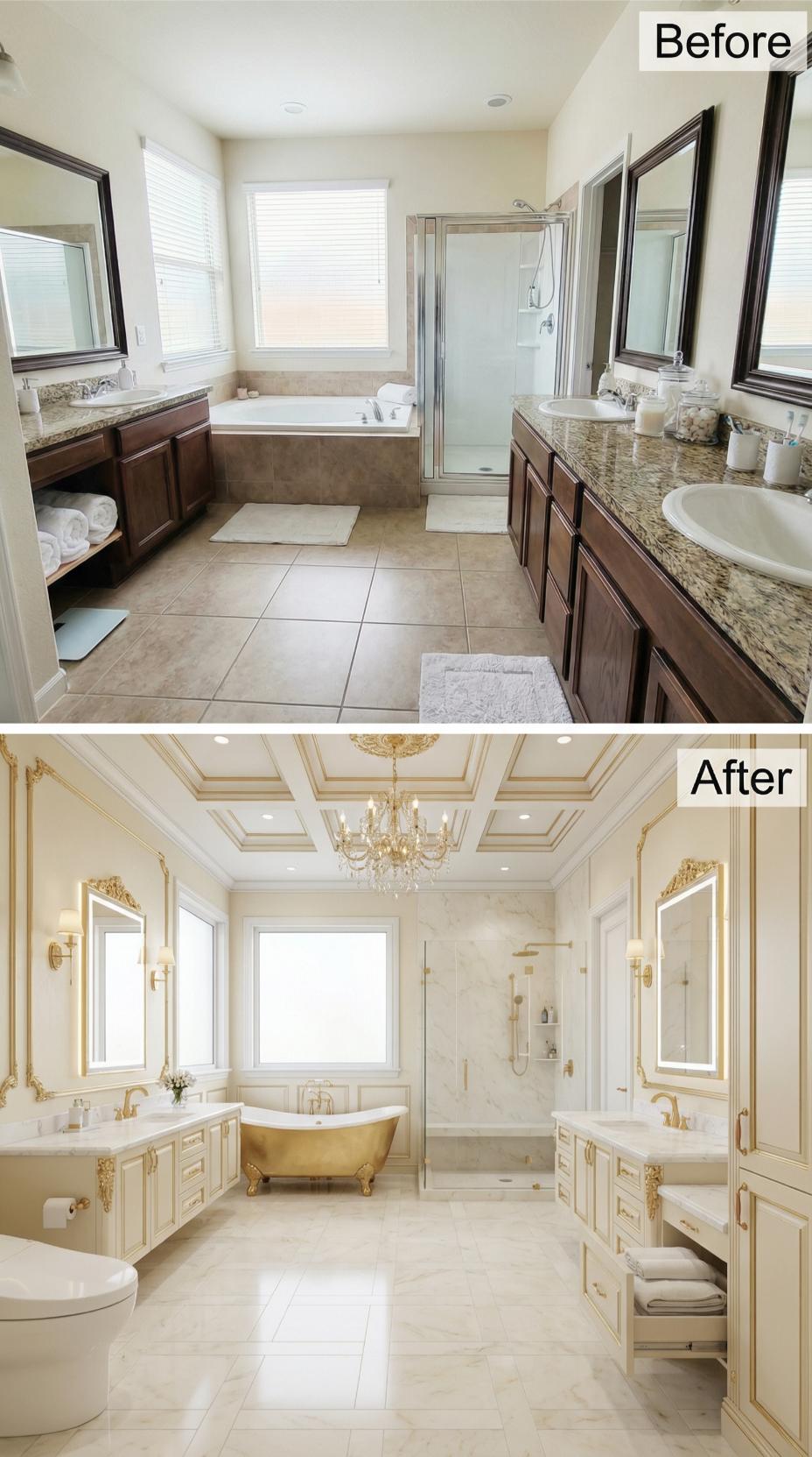 Rich golden accents and marble surfaces transform this builder-grade primary bathroom for germophobes into a luxurious retreat. Ornate ceiling details with coffered panels replace plain drywall, while dual vanities gain decorative molding and premium countertops. A stunning clawfoot tub becomes the centerpiece, complemented by crystal chandelier lighting and elegant wall sconces that elevate the entire space.