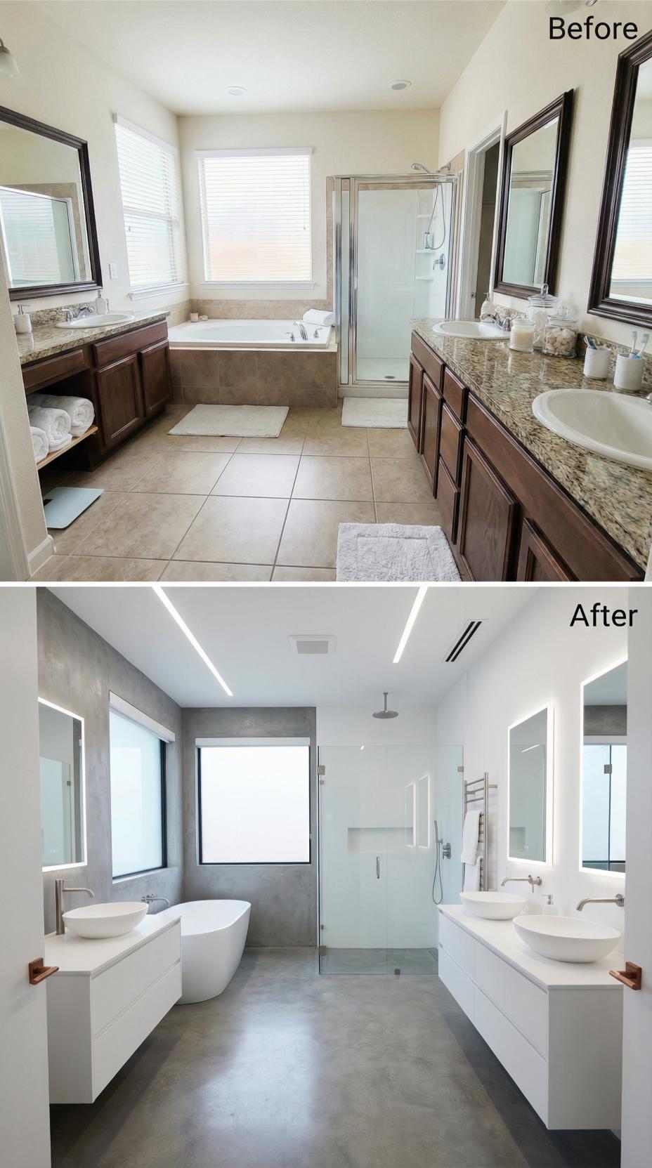 Warm wood cabinetry and granite countertops gave way to floating white vanities with vessel sinks and clean geometric lines. The cramped shower enclosure expanded into a spacious glass-walled wet room, while the corner soaking tub relocated for better flow. Dramatic charcoal tiles replace beige flooring, and recessed linear lighting creates a sophisticated spa atmosphere perfect for those seeking ultra-modern hygiene solutions.