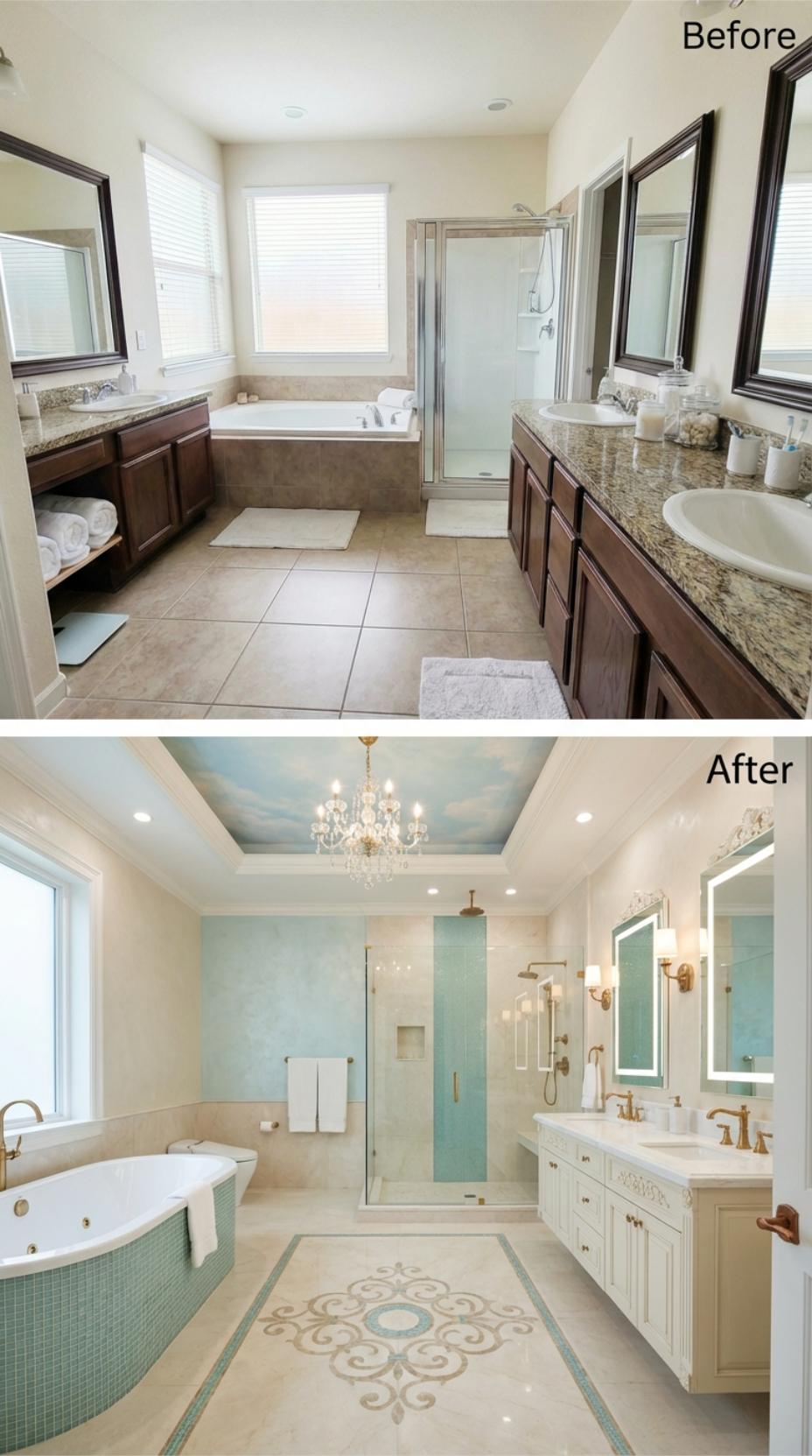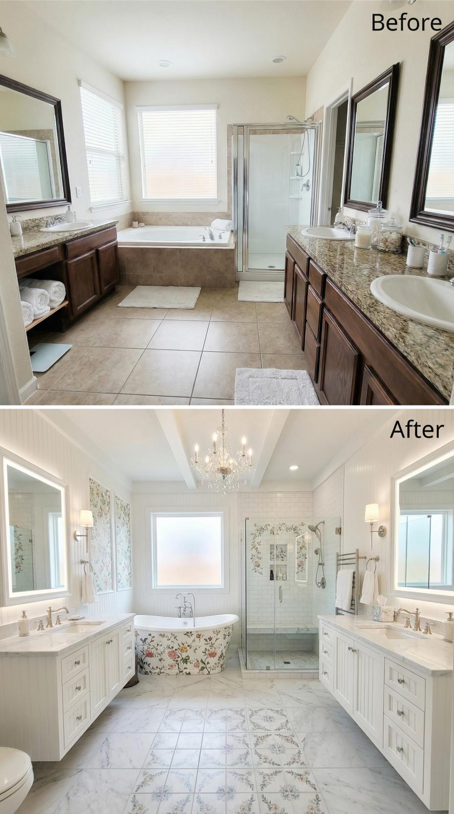 Dark granite countertops and brown cabinetry gave way to pristine white vanities with marble surfaces and delicate floral wallpaper. The cramped corner tub evolved into a stunning freestanding soaking tub adorned with botanical motifs, while crystal chandeliers and coffered ceilings replaced basic builder lighting. Patterned floor tiles and glass-enclosed shower complete this germaphobe’s dream retreat.