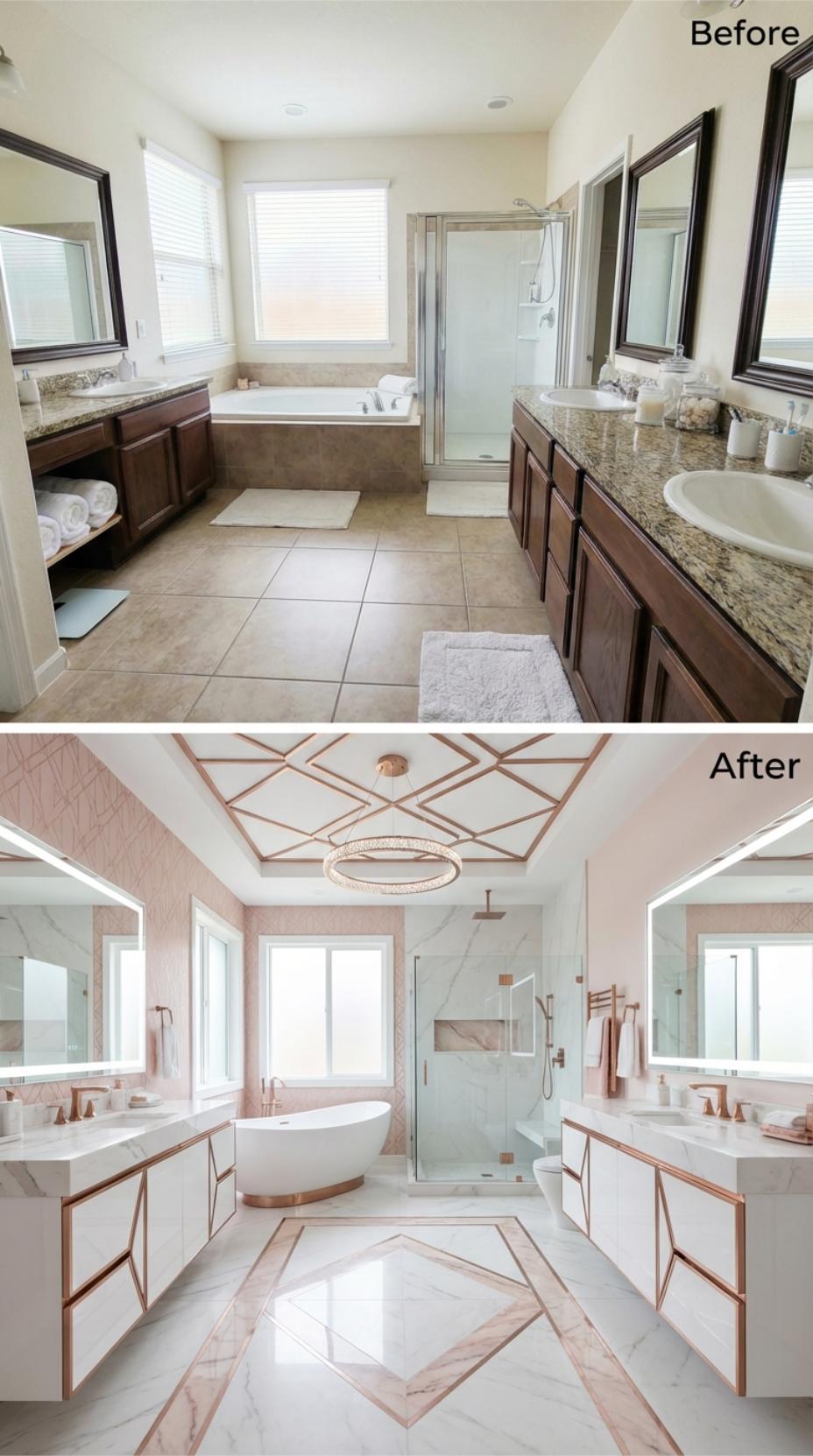 Dramatic geometric ceiling details and rose gold accents elevate this builder-grade primary bathroom for germophobes into a sophisticated retreat. White marble surfaces replace granite countertops while floating vanities with rose gold frames create an airy, modern aesthetic. The freestanding tub anchors the space as a focal point, complemented by seamless glass shower enclosures and coordinating rose gold fixtures throughout.