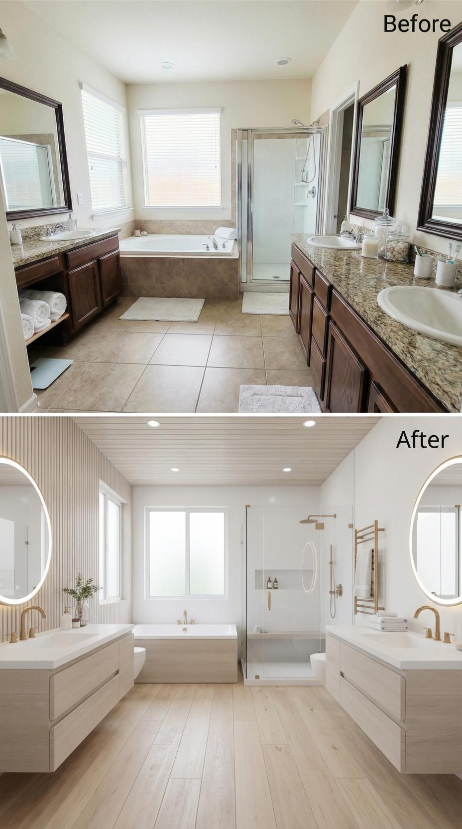 Warm wood flooring and fluted accent walls transform this formerly cramped space into a luxurious retreat. The renovation eliminates cluttered granite counters and dark cabinetry, introducing floating vanities with clean white quartz surfaces. Modern brass fixtures and frameless glass create an open, airy atmosphere, while round mirrors and integrated lighting deliver sophisticated functionality that prioritizes both style and cleanliness.