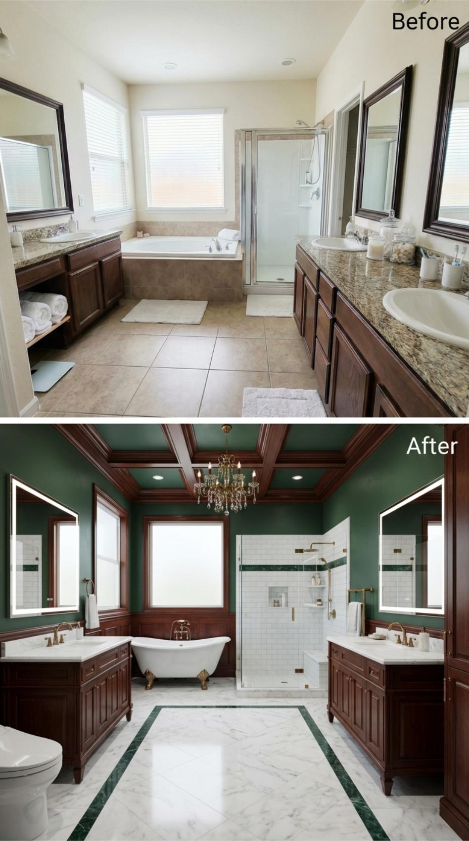 Rich emerald walls and a stunning coffered ceiling transform this builder-grade primary bathroom into a luxurious retreat. The original granite countertops and basic shower give way to pristine white marble surfaces, gold fixtures, and an elegant clawfoot tub. White subway tile with coordinating green accents creates a cohesive color story, while the crystal chandelier adds unexpected glamour to this sophisticated space.